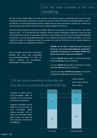 12% din totalul investitiilor industriale din luna mai sunt proiecte de peste 3000 mp Procentul se aplica atat in cazul investitiilor aflate in executie, cat si in cazul acelor ce urmeaza a fi demarate. Proportia investitiilor de sub 1000 mp este mai mare in cazul investitiilor aflate inaintea executiei – 60%, in timp ce in cazul halelor aflate deja in lucru, mai putin de 50% reprezinta investitii de sub 1000 mp.