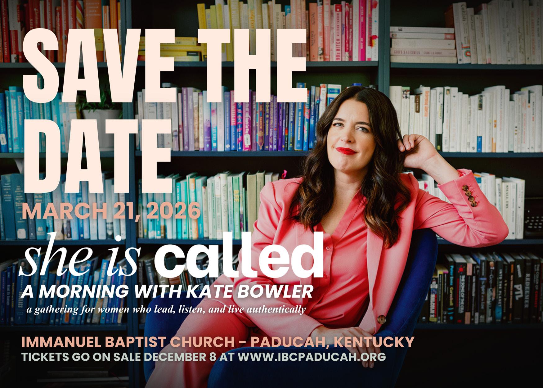 All women are invited to attend the Women’s Retreat to Paducah to see theologian, author, and podcaster Kate Bowler speak at Immanuel Baptist Church Paducah. More detailed information to come, but the loose schedule is: