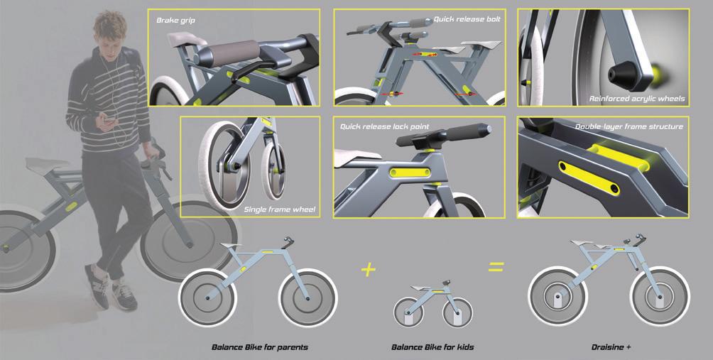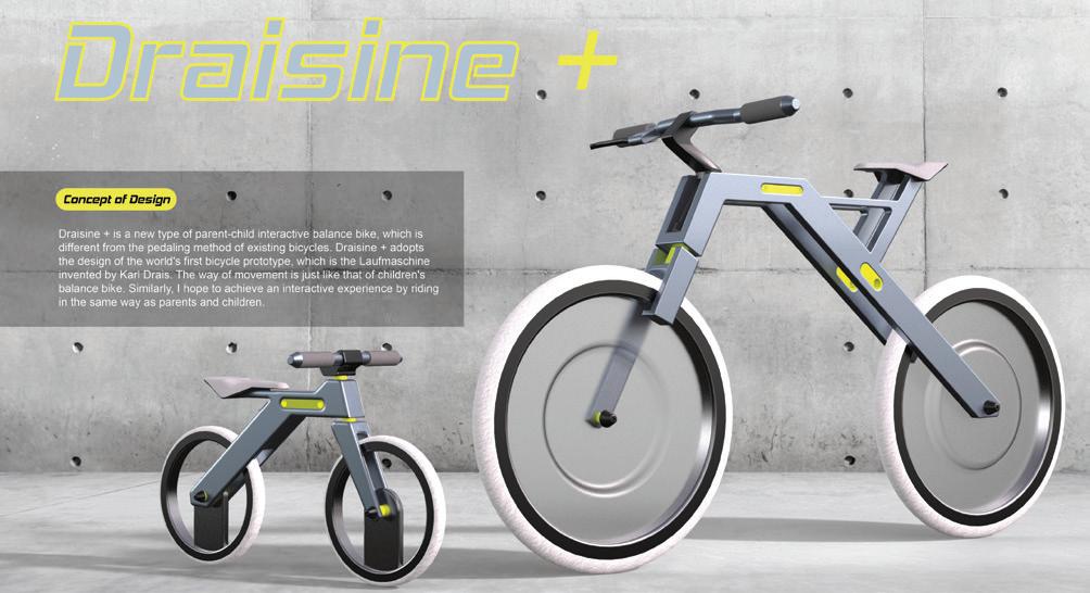 Draisine +是一台親子互動滑步車,設計發 想為自行車之父,卡爾•德萊斯,所設計的世 界上第一台自行車原型,使用方式近似現今孩 童使用的滑步車,由於發現孩童騎乘滑步車時, 父母無法與孩子以相同方式進行活動,希望透 過親子滑步車增加互動性及教導正確使用方式, 利用車架間隙容納小車,並使用快拆輪軸與插 銷分離、組合。 Designer 44 45 THE 24TH INTL. BICYCLE DESIGN COMPETITION Innovative bicycles/ services/ systems related to new style of living / 自行車新生活型態之創新服務/產品/系統 Innovative bicycles/ services/ systems related to new style of living / 自行車新生活型態之創新服務/產品/系統