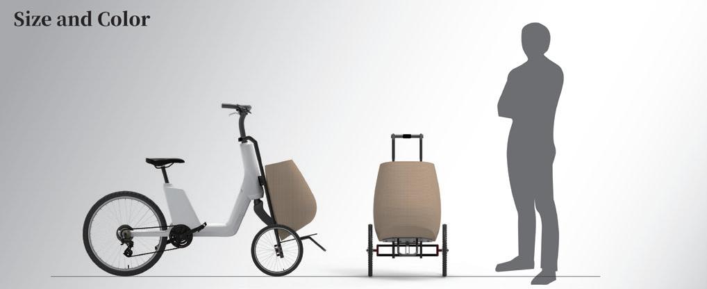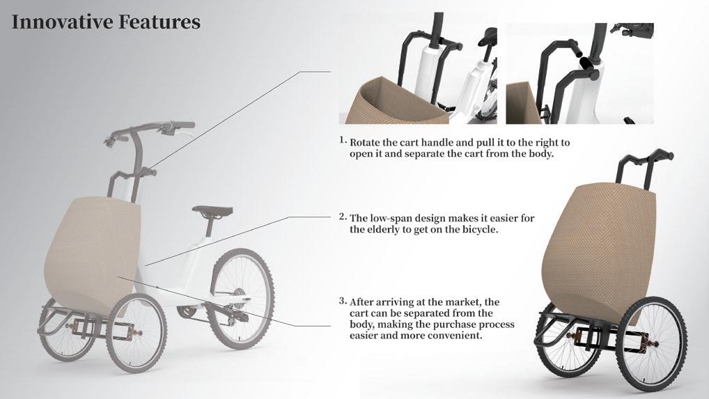 在台灣,逛市場是我們日常生活的一部分, 但在滿是人群的狹小通道騎乘機車買菜相當危 險,持續排放的廢氣弄得大家烏煙瘴氣,也造 成了空氣汙染,但對於一些人行動不便或缺乏 力氣的年長者,提著大包小包的長時間行走是 一種負擔。 ComBike是一款結合推車的電動自行車, 車身與推車部 分 可自由分離,讓買菜更休閒且 輕鬆。 Designer 詹昕喬 42 43 THE 24TH INTL. BICYCLE DESIGN COMPETITION Innovative bicycles/ services/ systems related to new style of living / 自行車新生活型態之創新服務/產品/系統 Innovative bicycles/ services/ systems related to new style of living / 自行車新生活型態之創新服務/產品/系統