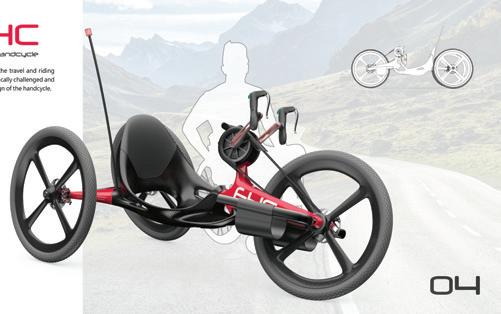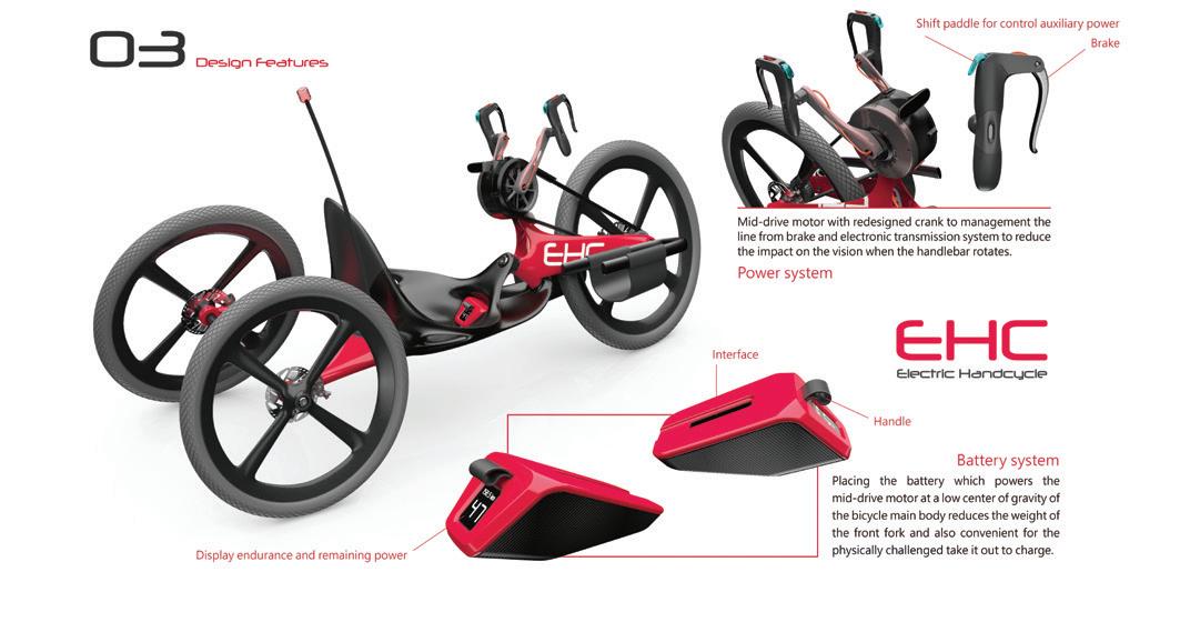 EHC是一部電能馬達輔助動力的旅行用途 手搖式自行車,目標是能提供給下肢不便的身 障人士更良好的運動與旅行體驗,在傳統手搖 式自行車的結構基礎上透過整合入電動馬達來簡 化變速機構並提供輔助動力來降低長途騎乘的困 難度,車體設計上透過重新設計的曲軸來整合煞 車與電子變速系統的線,減少握把旋轉時對視線 造成的影響並以皮帶輪來帶動使車體更安全與簡 潔,透過新聚合材質技術、3D列印和碳纖維材 料來製造,達到造型整合與輕量化的設計。 Designers Chia-Hsin, LEE 李佳芯 24 25 THE 24TH INTL. BICYCLE DESIGN COMPETITION Intelligent, innovative Ebike / 智慧化創新電動自行車 Intelligent, innovative Ebike / 智慧化創新電動自行車