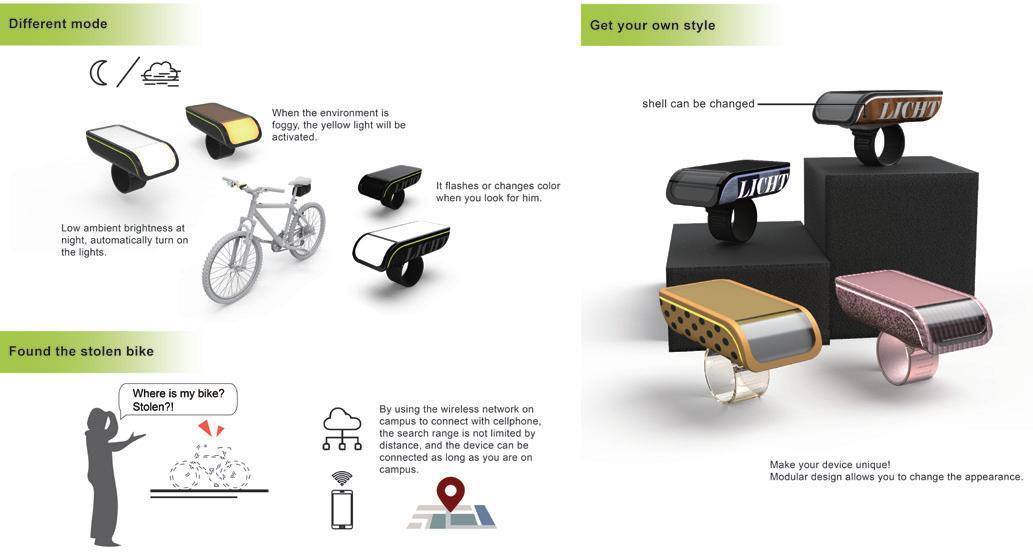 Licht智慧腳踏車尋車燈,可裝設於自行車 龍頭,利用網路以手機進行控制,在尋找車輛 時,閃爍燈光並發出自定義樂音,提醒車主車輛 位置,快速找到自己的愛車。 平時可作為夜晚騎行燈使用,透過感測器偵 測環境亮度、濕度與騎乘時的震動,自動開啟不 同模式的車燈,保護車主行車安全。 Designers 鄭崇德 38 39 THE 24TH INTL. BICYCLE DESIGN COMPETITION Intelligent bicycle components / 自行車智能化零配件 Intelligent bicycle components / 自行車智能化零配件