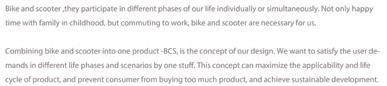 BCS can convert into bike and scooter. BCS can be used for parent-child sharing during family outings and can also be used for single-person bike that switch between long-range and shortrange. BCS is a bicycle that accompanies the growth of user and a design that integrates short and medium distance movement.