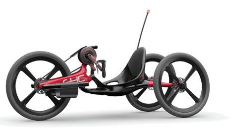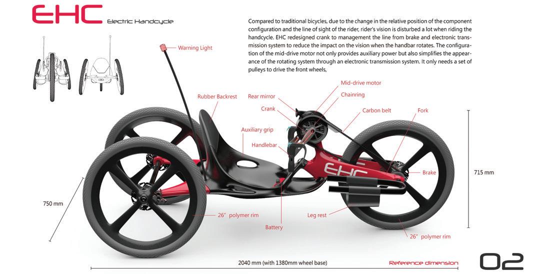 EHC is a travel-use handcycle with the auxiliary power unit system of an mid-drive electric motor, which provides a good exercise and travel experience for the physically challenged with lower limb disability. Based on the structure of a traditional hand-cranked bicycle, the handcycle integrates an electric motor to simplify the transmission mechanism and provide auxiliary power to reduce the difficulty of long-distance riding.