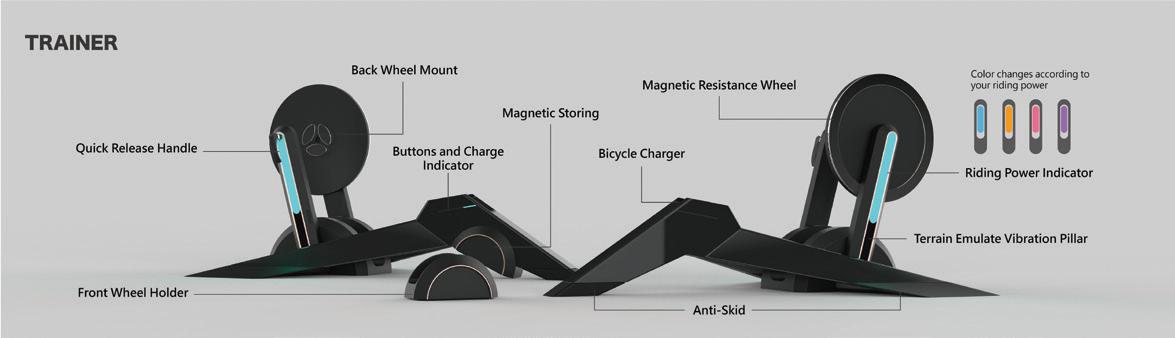SHiFT是使用極為簡單的電動自行車與智 慧訓練台組合。只要3步就可將自行車裝上訓練 台,不用30秒。現代人因花過多時間在工作, 導致許多人缺乏運動。SHiFT同時滿足了通勤與 室內訓練的需求,不只利用電動輔助通勤的上坡 路段,下班後也能在家輕鬆運動。智慧訓練器不 耗胎且非常安靜,親近友鄰。採用輕電輔系統滿 足短程通勤需求,且訓練台就作為充電座,非常 容易使用。 Easiest Train to Commute Experience Designer 34 35 THE 24TH INTL. BICYCLE DESIGN COMPETITION Intelligent, innovative Ebike / 智慧化創新電動自行車 Intelligent, innovative Ebike / 智慧化創新電動自行車