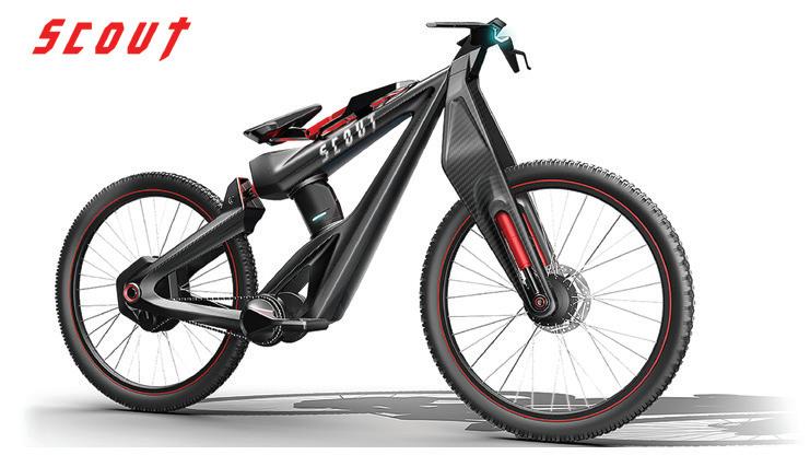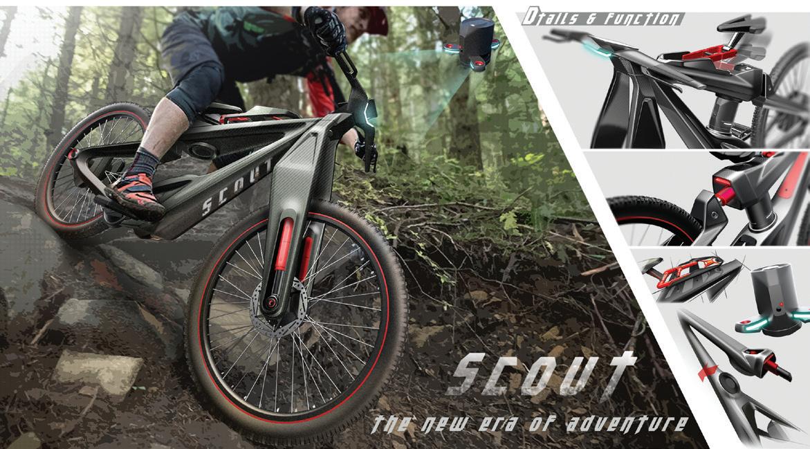 Taking the niche market as the departure point, Scout equip with intelligent drone technology and reinforced carbon fiber frame also increasing the safety and accessibility. Using drone to explore the terrain, seek safe routes and report back to the rider through the APP, also recording the processes of the self-challenge games. The drone is designed for the battery of the bike itself, also providing assistance power to the rider when going uphill and recharging when going downhill. The drone can be easily disassembled and recharged at ordinary times, achieving sustainability and mutualistic symbiosis.