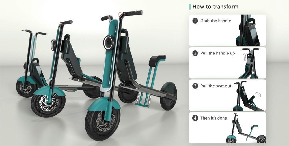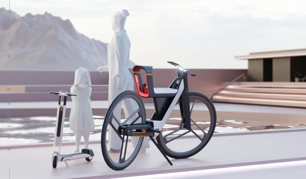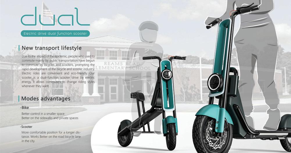 因為疫情影響,過去以公共交通通勤為主 的人已經開始騎自行車和滑板車通勤,促使自行 車和滑板車行業快速發展。電動車既方便又環 保。DUAL是一款由電動驅動的雙功能滑板車, 讓通勤者可以隨時改變騎乘方式。坐姿騎乘路 途較遠能更放鬆舒適,而滑板車模式讓使用者 在比較壅擠的地方可以更自由自在,自由決定 自己的騎乘方式。 Designers 沈鴻達 22 23 THE 24TH INTL. BICYCLE DESIGN COMPETITION Intelligent, innovative Ebike / 智慧化創新電動自行車 Intelligent, innovative Ebike / 智慧化創新電動自行車