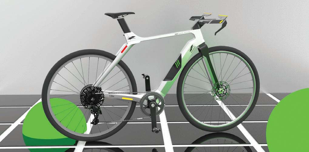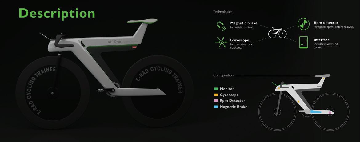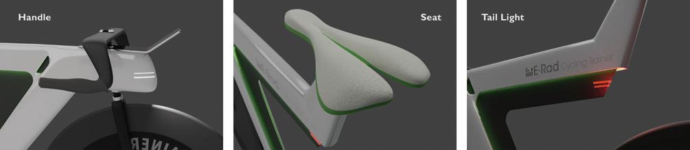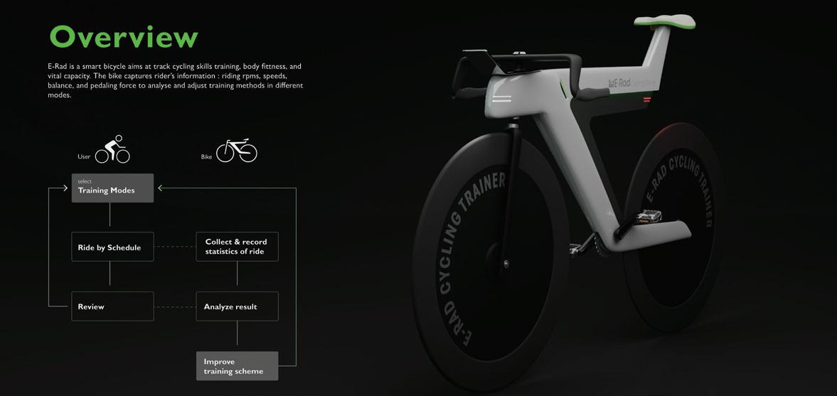E-Rad 是一台為場地自行車(Track Cycling) 設計的訓練用智能自行車,騎乘的同時偵測並記 錄騎乘者的資訊:轉速、速率、平衡、踩踏力道, 進行分析後依照不同的訓練模式調整最適合的訓 練規劃。總共4種訓練模式:固定飛輪、模擬賽、 有氧、衝刺,使用者可以搭配車上的操控面板自 行切換訓練模式,或者單純騎乘並且觀察檢測到 的數值來控制步調。 Designer 26 27 THE 24TH INTL. BICYCLE DESIGN COMPETITION Intelligent, innovative Ebike / 智慧化創新電動自行車 Intelligent, innovative Ebike / 智慧化創新電動自行車