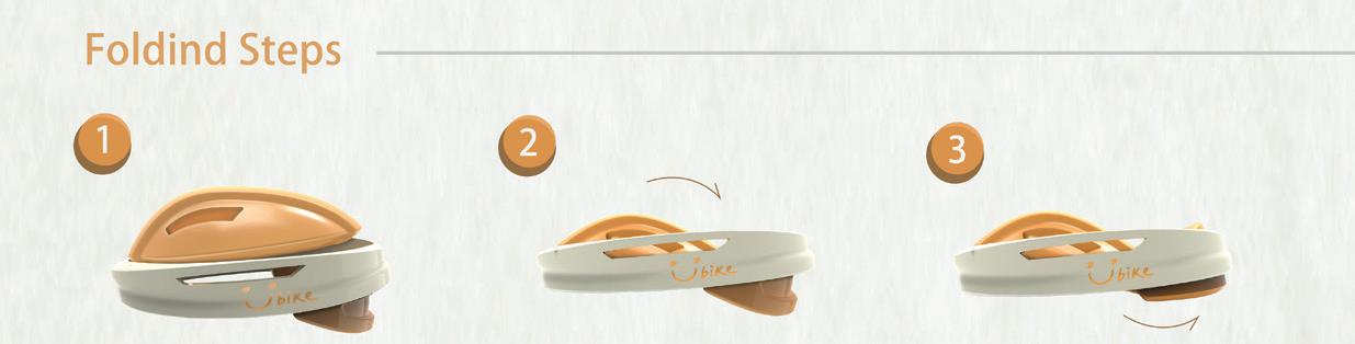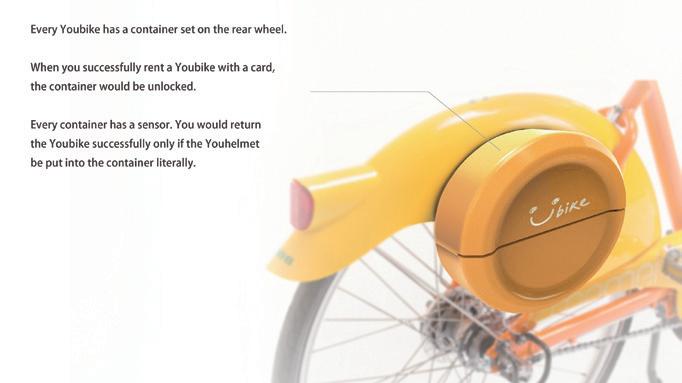 Youhelmet是專門為共享自行車Youbike 所設計。可折疊的設計,使Youhelmet便於攜 帶和收納。 每一頂Youhelmet皆有專屬的防水收納盒, 設置在Youbike的後輪,讓Youhelmet不受雨 天的雨水和濕氣影響。 為了避免遭竊取,防水收納盒配有防盜裝 置,在成功租借Youbike的同時,收納盒會解鎖; 還車時,使用者必須確實將Youhelmet放入收 納盒,方能成功歸還Youbike。 Youhelmet有著簡約的外型,不同於市面 上的競速自行車安全帽,讓它看起來活潑輕巧。 同時搭配橘白配色,使之和Youbike在外觀上 呈現一致的視覺效果。 Designer 羅雅瑄 50 51 THE 24TH INTL. BICYCLE DESIGN COMPETITION Innovative bicycles/ services/ systems related to new style of living / 自行車新生活型態之創新服務/產品/系統 Innovative bicycles/ services/ systems related to new style of living / 自行車新生活型態之創新服務/產品/系統