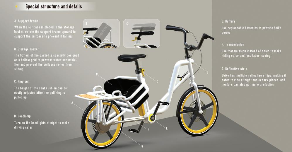 Sbike是一款大容量的共享電動輔助自行 車,專門設計給攜帶大型行李出外旅行且需要騎 乘自行車的人們,最大可以容納20吋的行李箱, 平時你也可以將書包或是購物袋置放入收納籃 中。此外,Sbike採用無鍊條傳動以及電動輔助 的方式,讓騎行的過程中達到更安全、更省力的 效果,讓Sbike成為一輛可以有效分擔腳踏車騎 士行囊重量的共享自行車。 Designer 蒲郁淇 46 47 THE 24TH INTL. BICYCLE DESIGN COMPETITION Innovative bicycles/ services/ systems related to new style of living / 自行車新生活型態之創新服務/產品/系統 Innovative bicycles/ services/ systems related to new style of living / 自行車新生活型態之創新服務/產品/系統