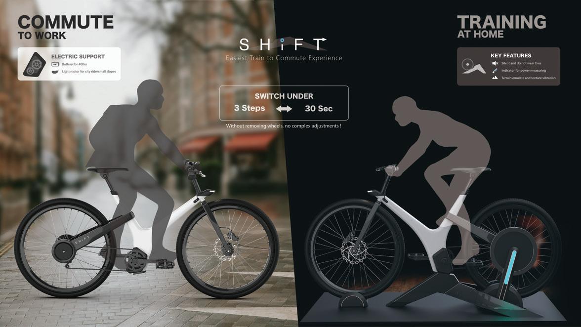Ting-Han, CHEN 陳庭翰 that is super simple to use. It only takes 3 steps to mount the bike to the trainer, taking less than 30 seconds. Since people nowadays spend so much time on work, they are lack time to exercise. SHiFT fulfills the needs of people who want to commute and exercise at home due to several conditions. The smart trainer does not wear tires and is super silent, which is friendly to neighbors. A lightweight motor system on the bicycle fulfills short commute needs, and the trainer also works as a charger.