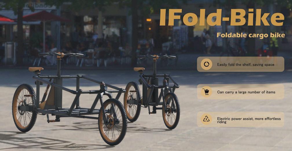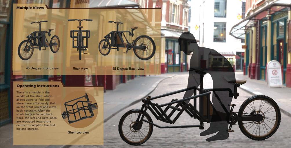市面上現有的載貨自行車大多無法折疊, 過度佔用空間,日常生活騎行十分不便。IFoldBike改善了貨架無法摺疊收納的問題。更符合現 代人使用自行車的方式,多功能使用,讓您在不 同的情況下輕鬆自如地騎行,創造全新的體驗。 架子中間有一個把手,可以讓用戶更輕鬆地 折疊。向後拉起前輪。向後鎖定後,左右兩側向 中心收齊,完成折疊。 Designer 28 29 THE 24TH INTL. BICYCLE DESIGN COMPETITION Intelligent, innovative Ebike / 智慧化創新電動自行車 Intelligent, innovative Ebike / 智慧化創新電動自行車