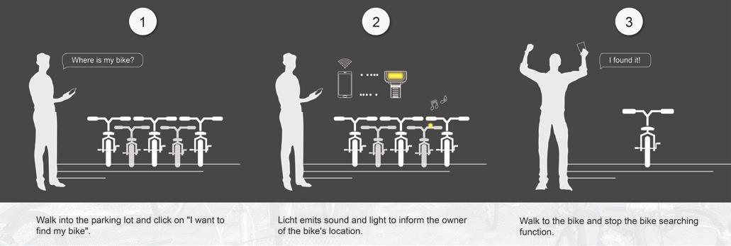 Licht Intelligent Bike Finder Light (Licht) can be installed on the stem of a bicycle and controlled by cellphone through the Internet. When you are looking for the bike, it flashes and emits a customized sound to show the bike's location, so you can find your bike quickly.