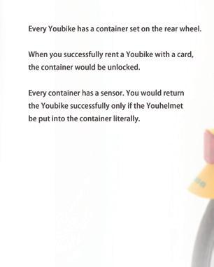 To avoid being stolen, there is an anti-theft device in each container. When you successfully rent a Youbike with a card, the container would be unlocked. Every container has a sensor. You would return the Youbike successfully only if the Youhelmet be put into the container literally.