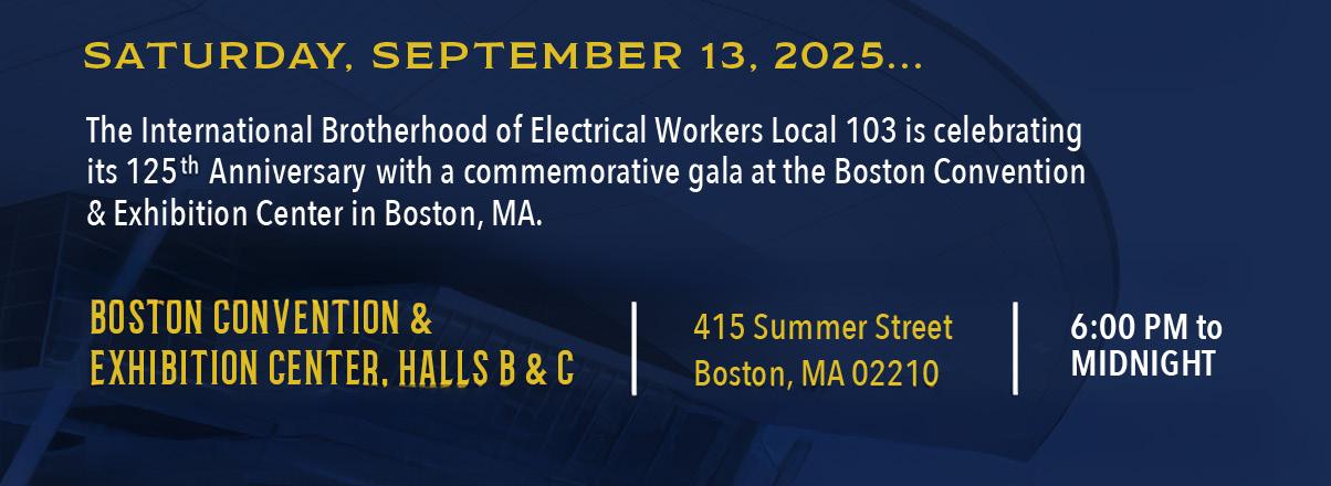 We are now counting down to a celebration 125 years in the making. On Saturday, September 13, we will gather at the Boston Convention & Exhibition Center to honor IBEW 103’s legacy and look ahead to its future. It will be a night to remember, and I hope to see you there. Whether you are out on the jobsite, training for the next step in your career, or spending well-earned time with your family, know that your work continues to move this union and this city forward.