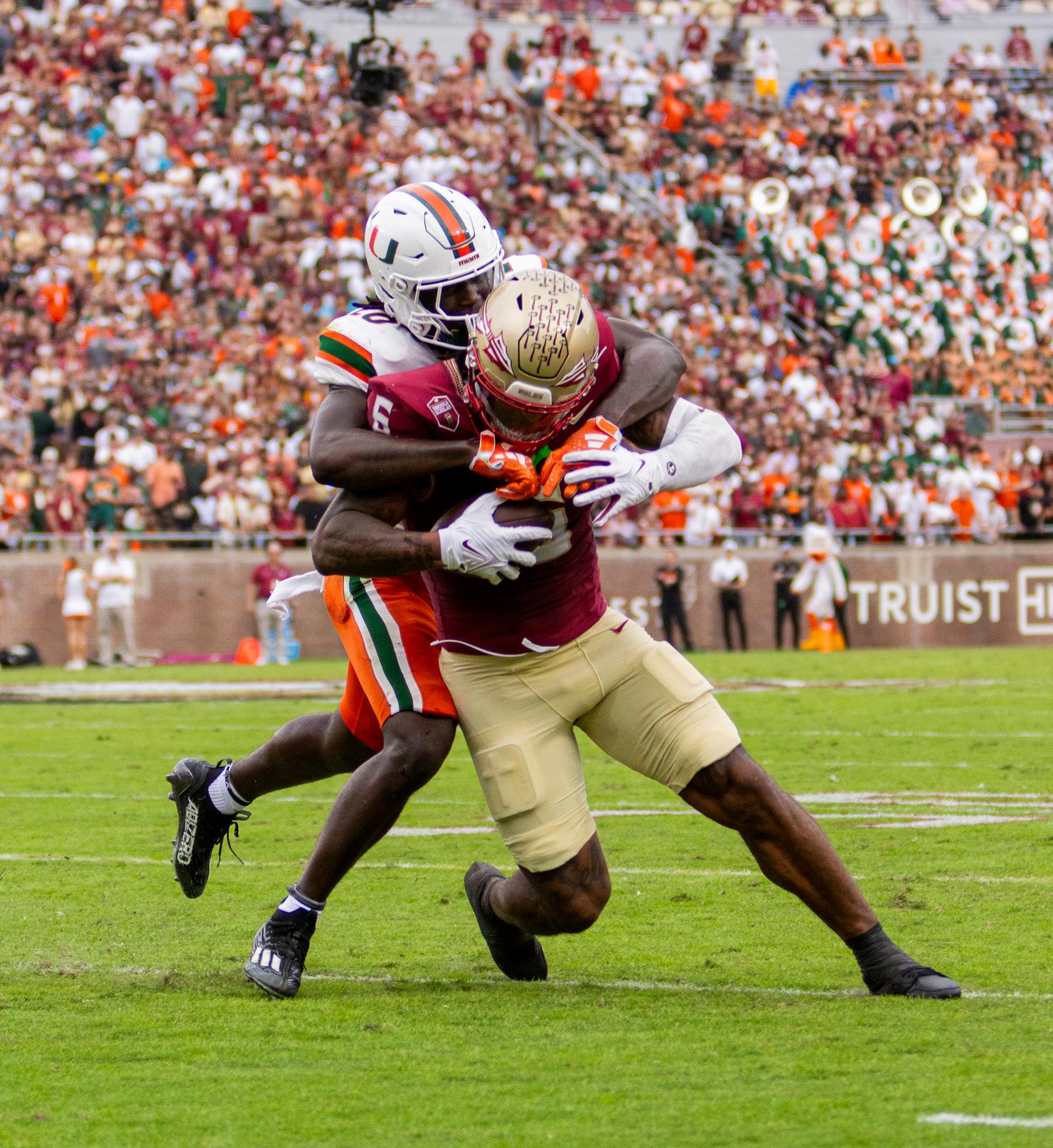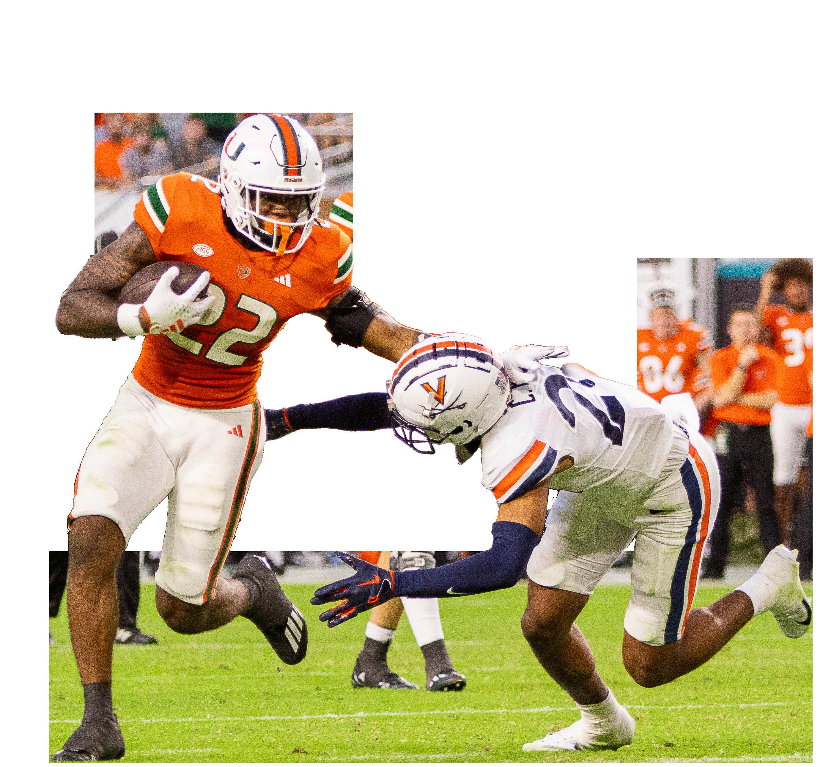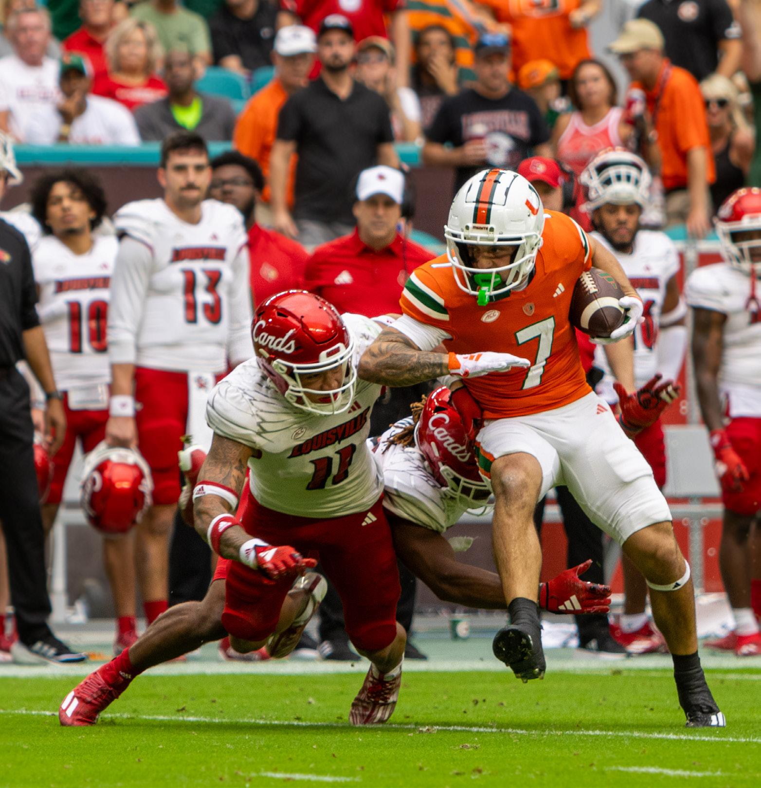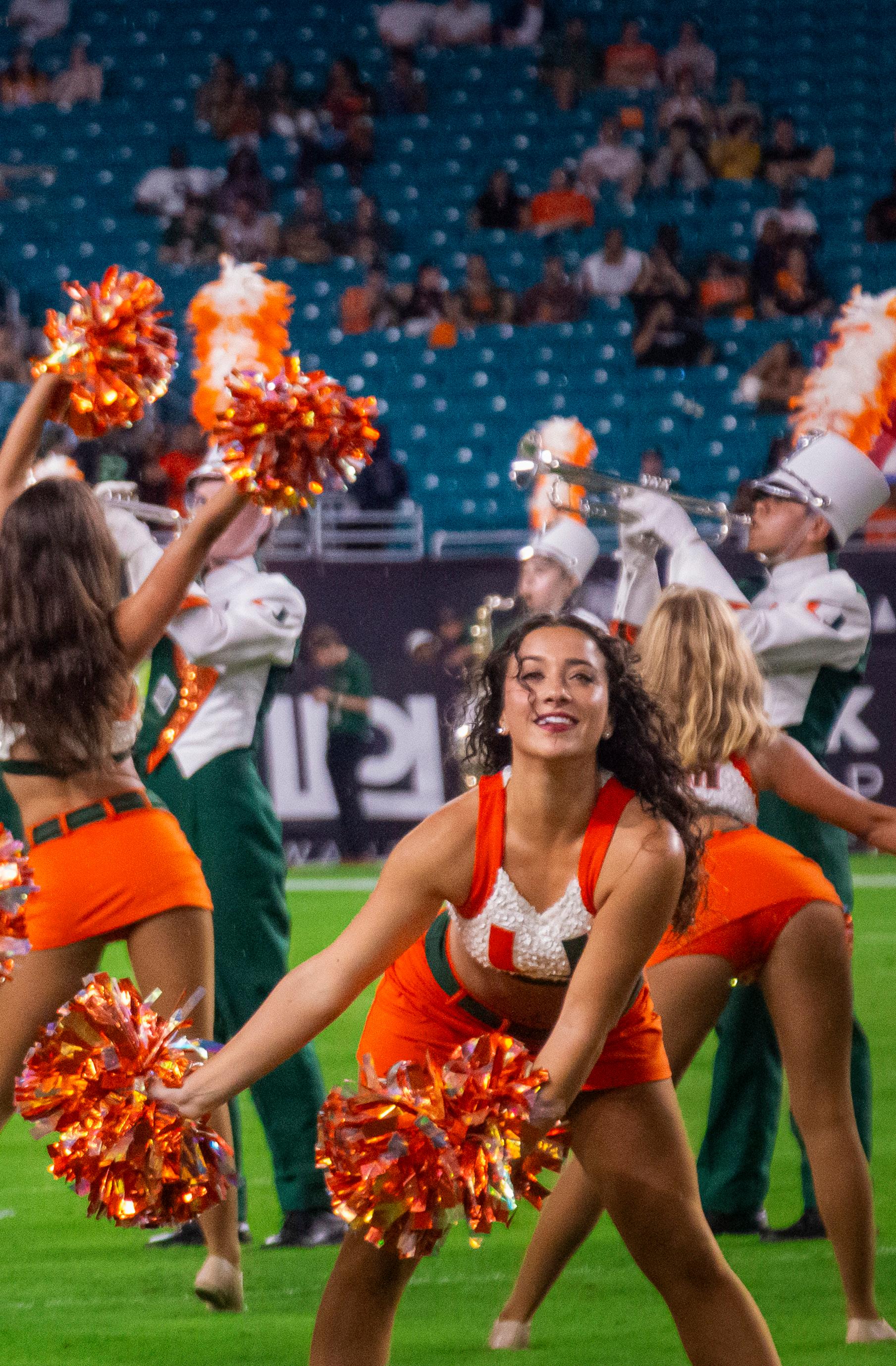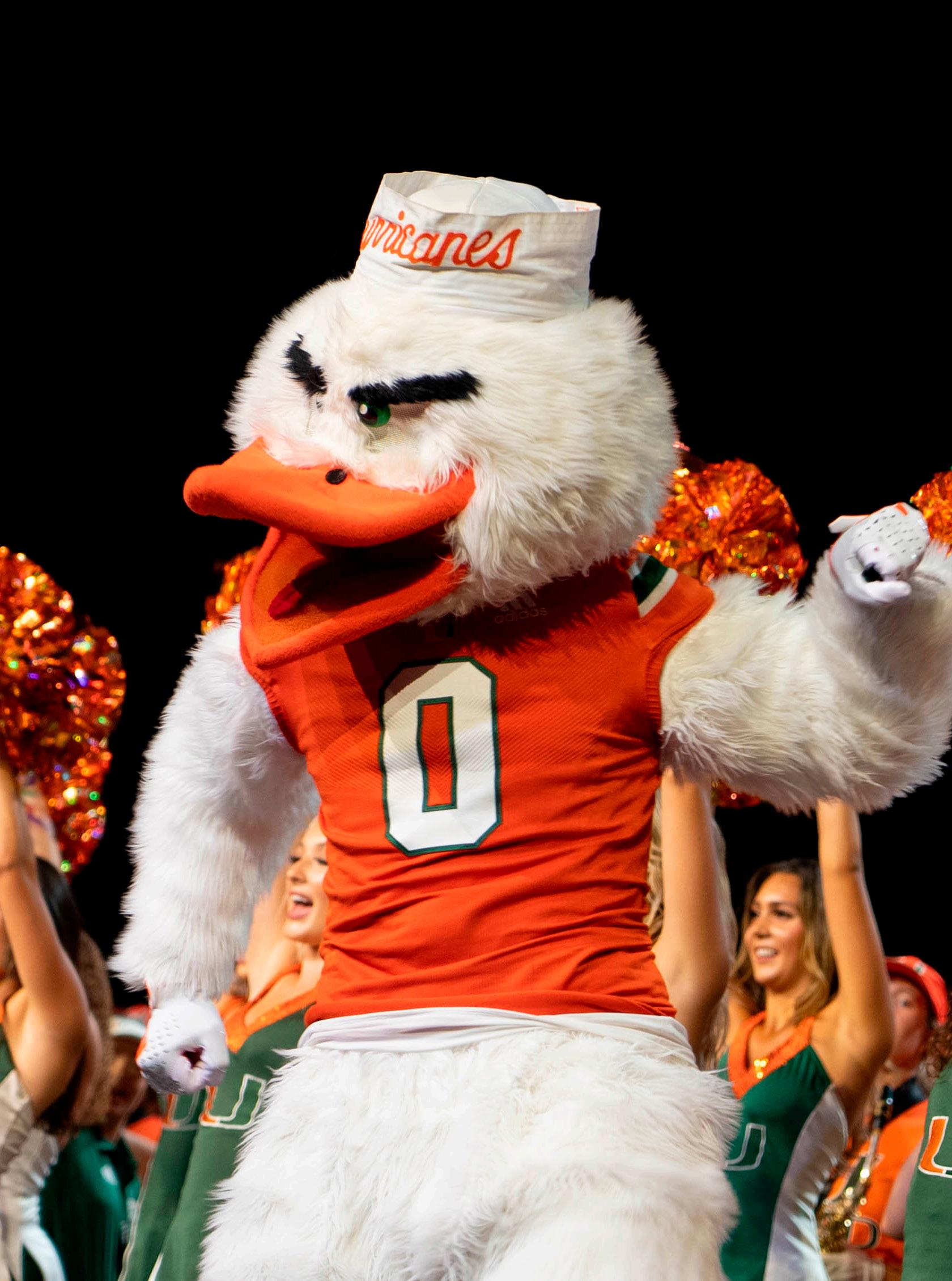 RUN OUT ONTO THE FIELD At the Homecoming football game against Virginia, Sebastian the Ibis, dressed in his Iron Arrow jacket, leads the football team out at Hard Rock Stadium. The game, which would eventually lead to a 29-26 win in overtime, highlighted ‘Cane alumni by bringing them out onto the field. Alumni of Iron Arrow, the Sunsations, the Hurricanettes, the Band of the Hour and UCheer were all brought out onto the field for performances. The tradition brings together generations of 'Canes that have all come back to Miami for the annual Homecoming celebrations, keeping them connected from all over the world. Photo by Char Jones