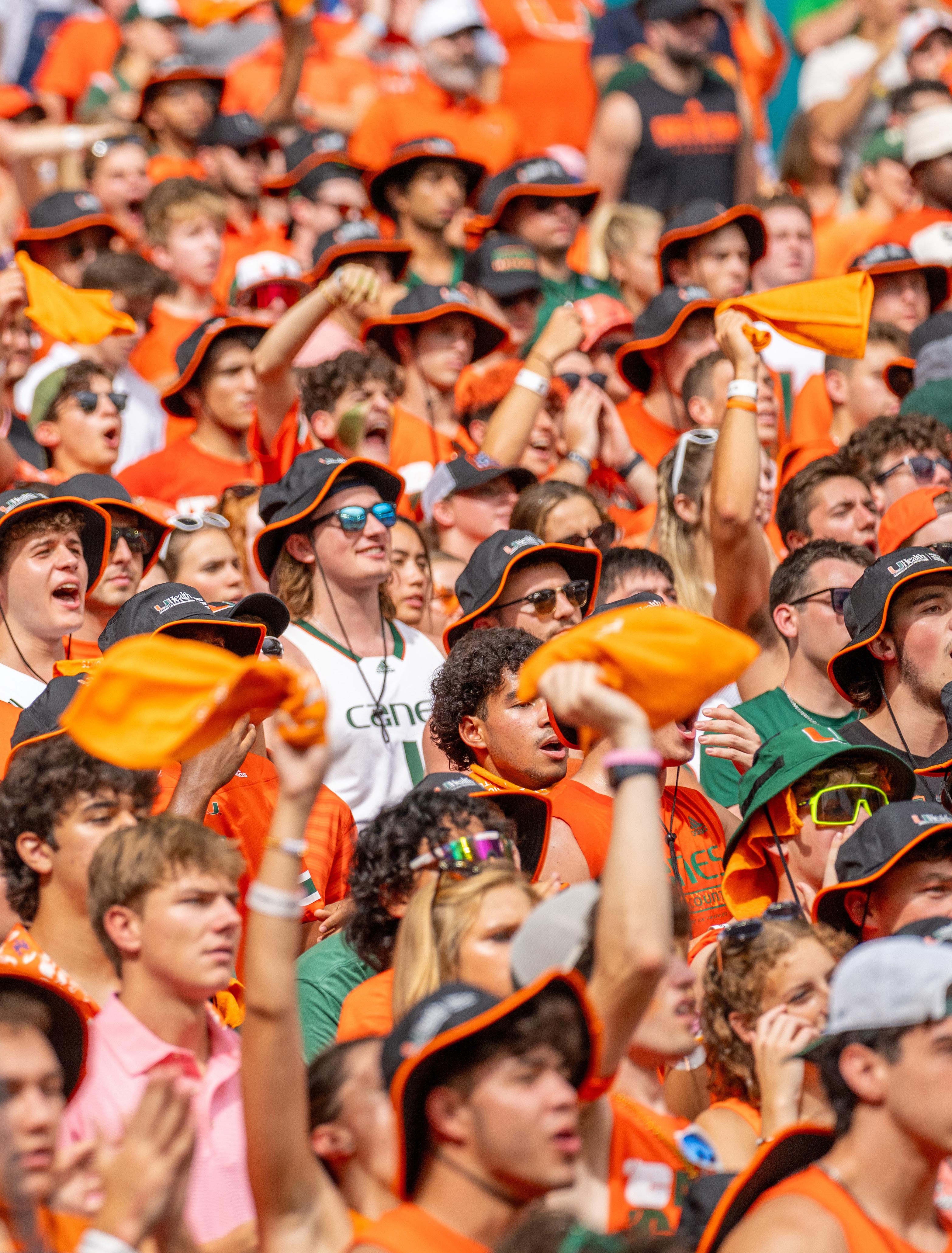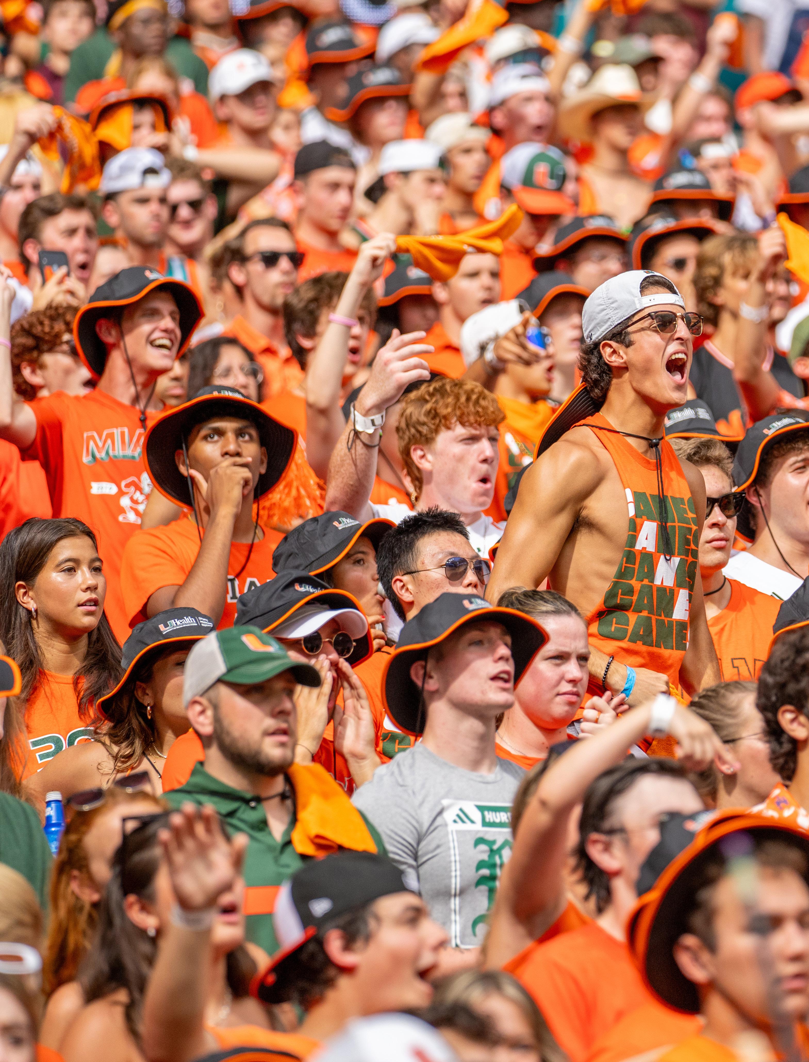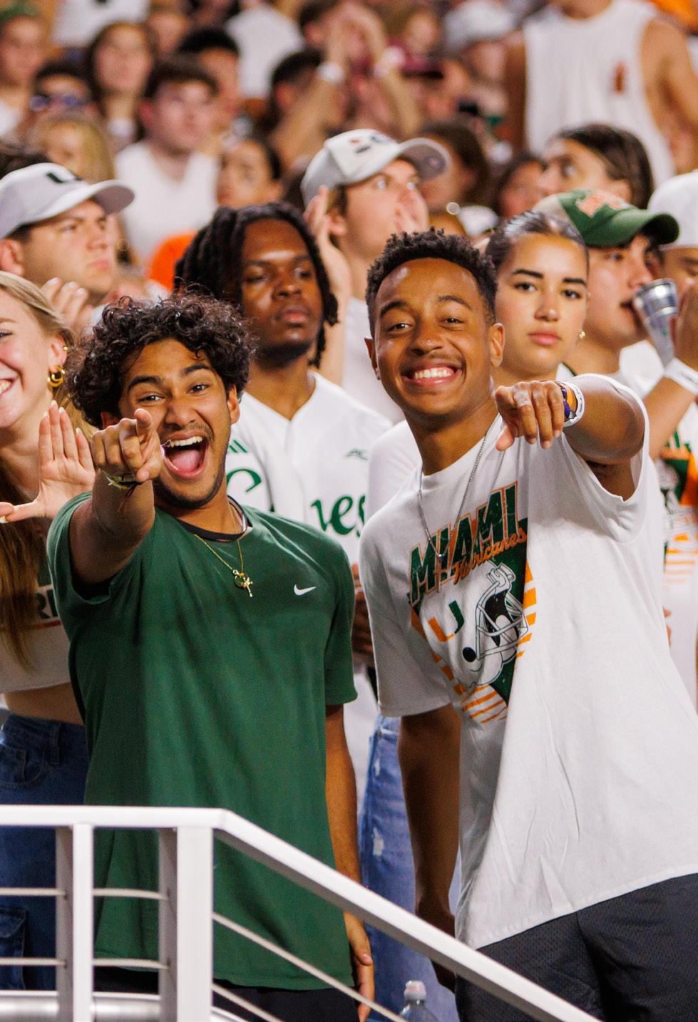STUDENT SECTION HYPE During the first quarter of the football game 23-20 loss against Georgia Tech, students fill up the designated student section and throw up the "U" with excitement. Students have the luxury of purchasing discounted tickets located on the visiting side next to the Frost Band of the Hour. They can also enjoy complimentary transportation to and from the stadium every 15 minutes through a bus service paid for by the university. Spending time with other students and friends allows current 'Canes to make memories at football games that they can remember even after they graduate from the university. Photo by Char Jones