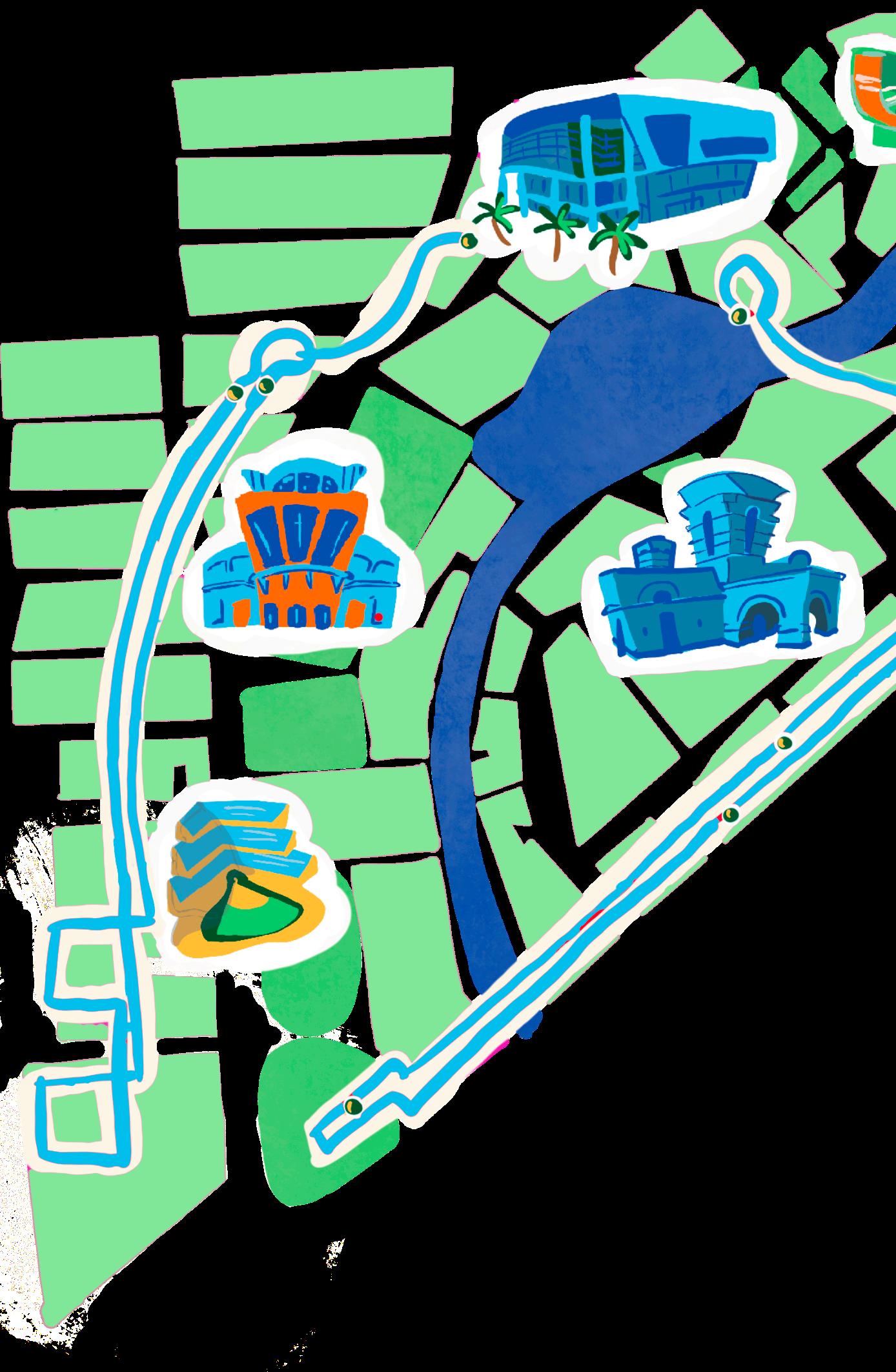 BIRDS EYE VIEW A satellite image of the entire University of Miami Coral Gables campus. The campus is located on 239-acres of land at the heart of a residential community. It is built around man-made Lake Osceola, and the campus houses over 5,000 students. When UM opened in 1926, the first building constructed was the Solomon G. Merrick building, which still stands today. Photo courtesy of Getty Images