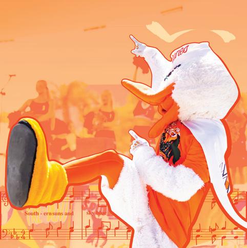 FINAL QUARTER FOOTBALL Students in the front row of the student section at Hard Rock Stadium sing the Alma Mater following the football win against Bethune-Cookman. They raise their pointer fingers in the air at the end of the 48-7 winning game and sway side to side to mock the gentle swaying of a palm tree. William “Bill” S. Lampe wrote the words to the song on the back of an envelope and an overdue bill from a printer, making him an essential part of UM history.