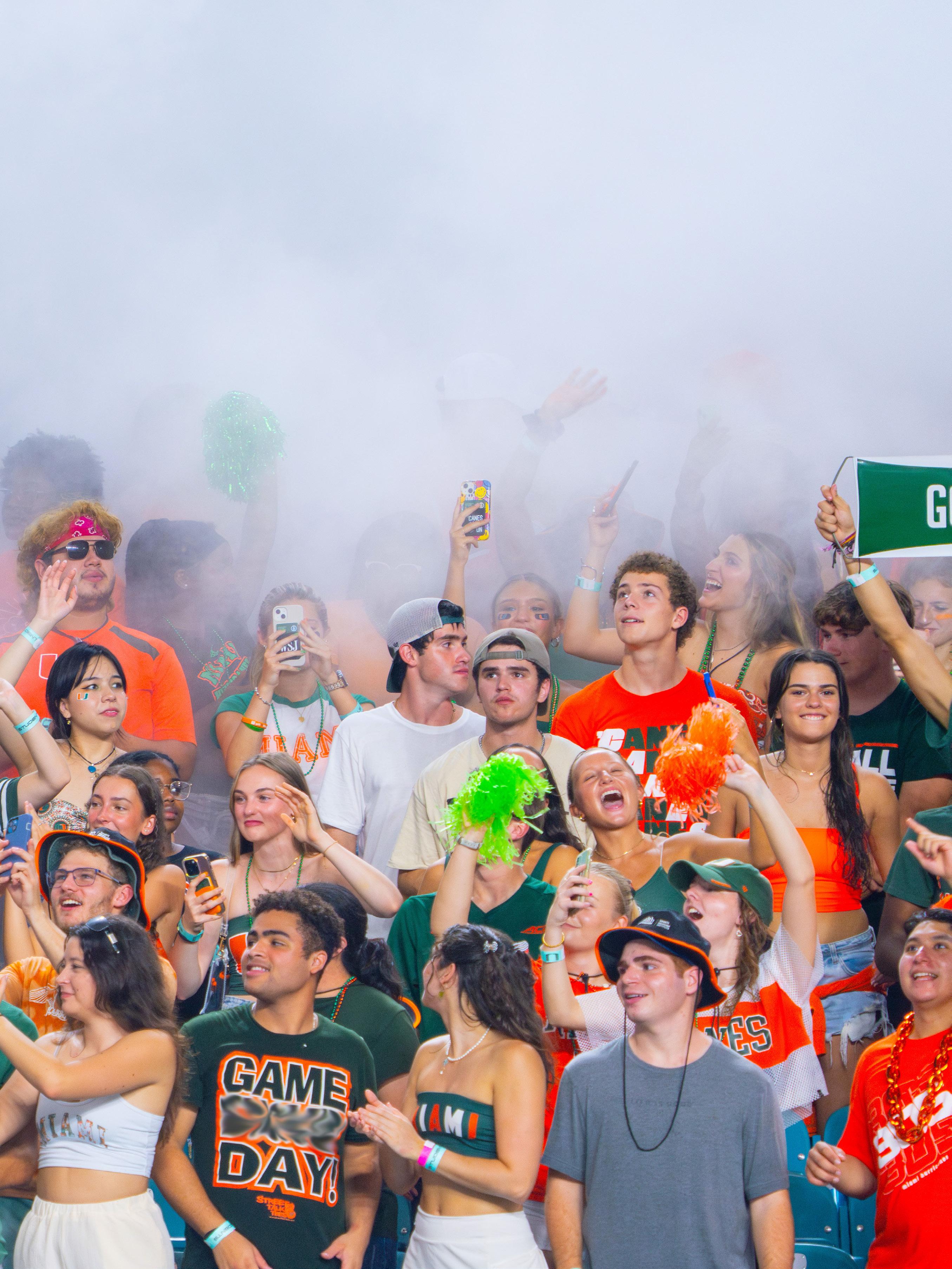 STUDENT SMOKE SECTION In order to bring a unique element to Miami football games, the university created the student smoke section. First occurring in 2013, the student smoke section allows students submit an application for each football game and be selected to set off the smoke before a game. The cans students set off release pressurized air that erupts in a white smoke. Photo by Jared Lennon