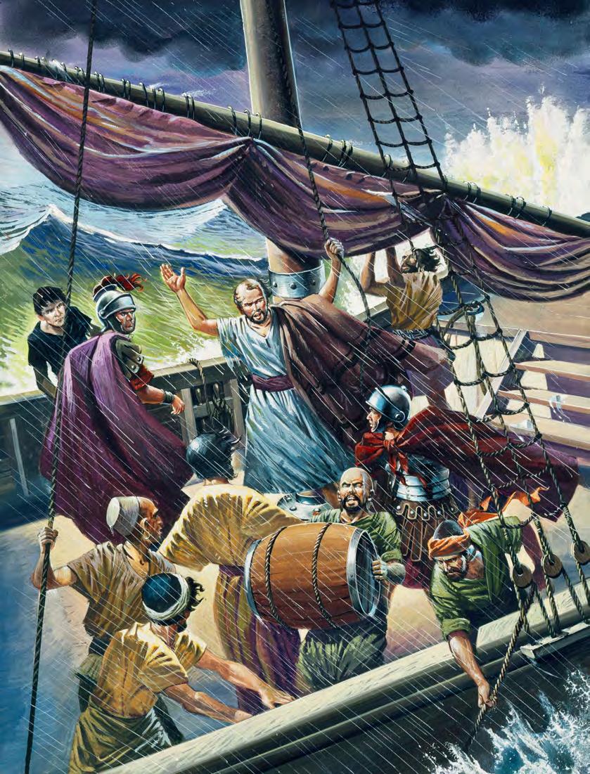 began to fight over his words. However, Paul was rescued from injury and taken before the Roman governor. Ultimately, the decision was made that Paul would stand trial before the powerful Roman emperor, Caesar. The governor arranged for Paul and other prisoners to sail to Rome under the watchful eye of a Roman centurion and his soldiers. Would Paul trust God with his future? How would God strengthen him when the voyage became dangerous? Would the apostle rely on God for his protection? How might Paul, even while a prisoner, confidently offer hope to others facing the same danger?