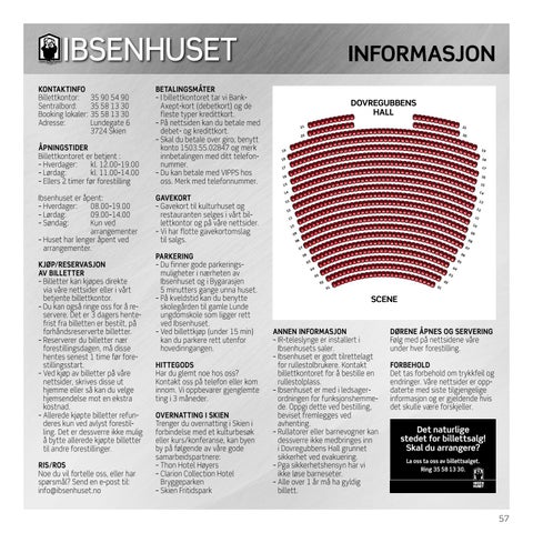 INFORMASJON KONTAKTINFO Billettkontor: 35 90 54 90 Sentralbord: 35 58 13 30 Booking lokaler: 35 58 13 30 Adresse: Lundegate 6 3724 Skien ÅPNINGSTIDER Billettkontoret er betjent : – Hverdager: kl. 12.00–19.00 – Lørdag: kl. 11.00–14.00 – Ellers 2 timer før forestilling Ibsenhuset er åpent: – Hverdager: 08.00–19.00 – Lørdag: 09.00–14.00 – Søndag: Kun ved arrangementer – H uset har lenger åpent ved arrangementer. KJØP/RESERVASJON AV BILLETTER – B illetter kan kjøpes direkte via våre nettsider eller i vårt betjente billettkontor. – D u kan også ringe oss for å reservere. Det er 3 dagers hente frist fra billetten er bestilt, på forhåndsreserverte billetter. – Reserverer du billetter nær forestillingsdagen, må disse hentes senest 1 time før fore stillingsstart. – Ved kjøp av billetter på våre nettsider, skrives disse ut hjemme eller så kan du velge hjemsendelse mot en ekstra kostnad. – A llerede kjøpte billetter refunderes kun ved avlyst forestil ling. Det er dessverre ikke mulig å bytte allerede kjøpte billetter til andre forestillinger. RIS/ROS Noe du vil fortelle oss, eller har spørsmål? Send en e-post til: info@ibsenhuset.no