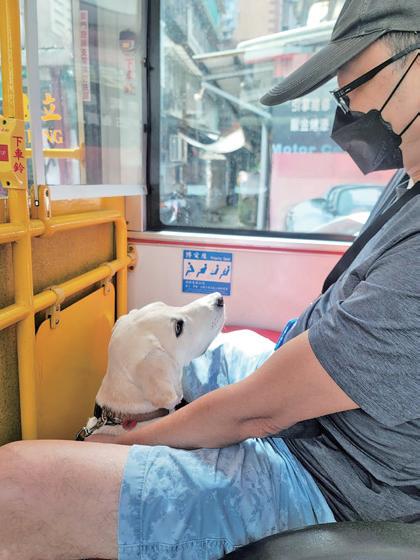 第一次到社區外做社會化練習,看公車從眼前 經過,被公車開車門的聲音嚇一跳。現在能穩 定趴在公車亭的座椅下看路人上下公車。