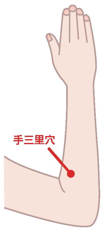 手三里穴是手陽明大腸經的穴道,與足陽明胃經的足三里穴相 輔相成、上呼下應。手三里穴位於橈骨小頭的橈背側,正下方有伸 腕長短肌交接與旋後肌,也因此在自我按壓手三里穴時,被壓手主 動做伸腕或橈偏的動作時,會感受到手三里穴的下方有肌肉正在收 縮。