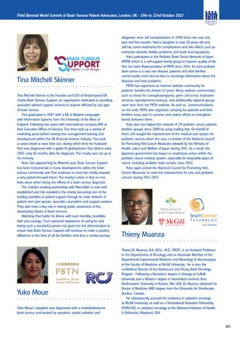 allogeneic stem cell transplantation in 1998 when she was one year and five months. Yuko’s daughter is now 20 years old and still has some treatments for complications and late effects such as endocrine disorder, fertility problems, and teeth bud hypoplasia. Yuko participates in the Pediatric Brain Tumor Network of Japan (PBTN) which is a self-support family group to improve quality of life. She has been Representative of PBTN since 2014. As each pediatric brain tumor is a very rare disease, patients and their families cannot easily come face-to-face to exchange information about the diseases and their problems. PBTN has organized an internet website community for patients’ families for almost 12 years. Many website communities such as those for craniopharyngioma, germ cell tumor, brainstem tumours, ependymoma tumours, and additionally regional groups were born from the PBTN website. As well as commnunications on the web, PBTN also organises camping for patients and their families every year in summer and makes efforts to strengthen bonds between them. Yuko also has helped the network of 29 pediatric cancer patients families’ groups since 2008 by using mailing lists. On behalf of them, she sought the improvement of the medical care system for pediatric cancers when she was a member of the National Council for Promoting Anti-Cancer Measures initiated by the Ministry of Health, Labor and Welfare of Japan during 2011. As a result, the Japanese government has begun to emphasize action within the pediatric cancer medical system, especially for intractable types of cancer, including pediatric brain tumors, since 2012. Yuko again joined the National Council for Promoting AntiCancer Measures to seek the improvement for rare and pediatric cancers during 2015-2017.