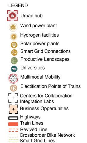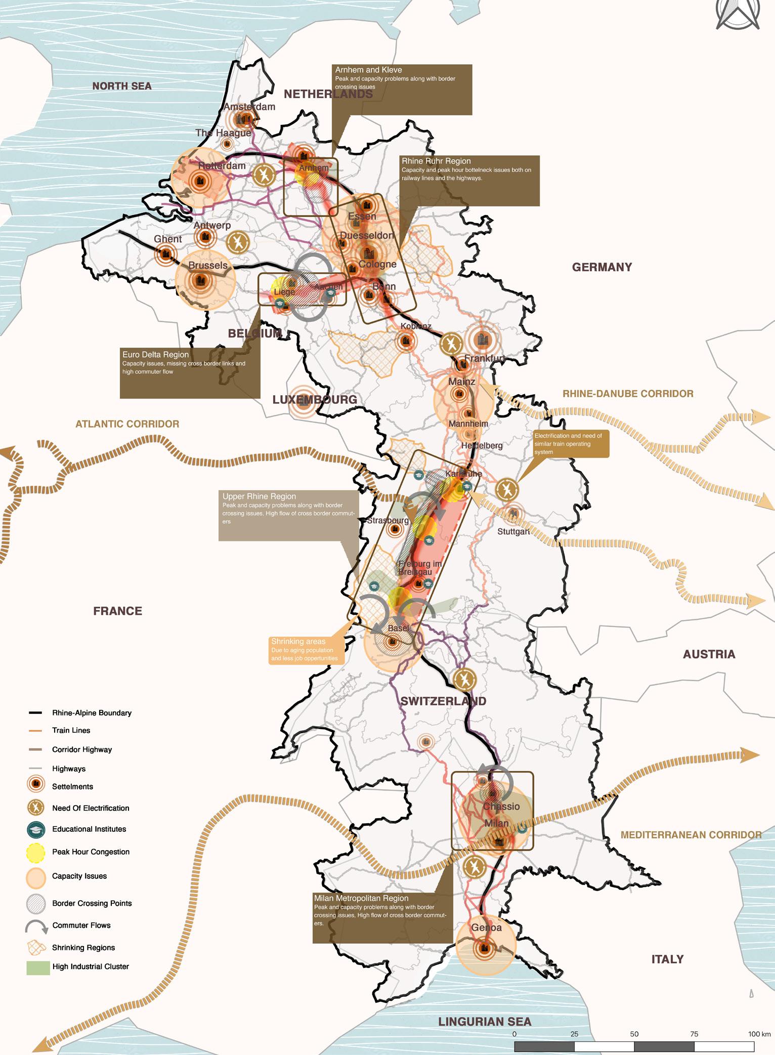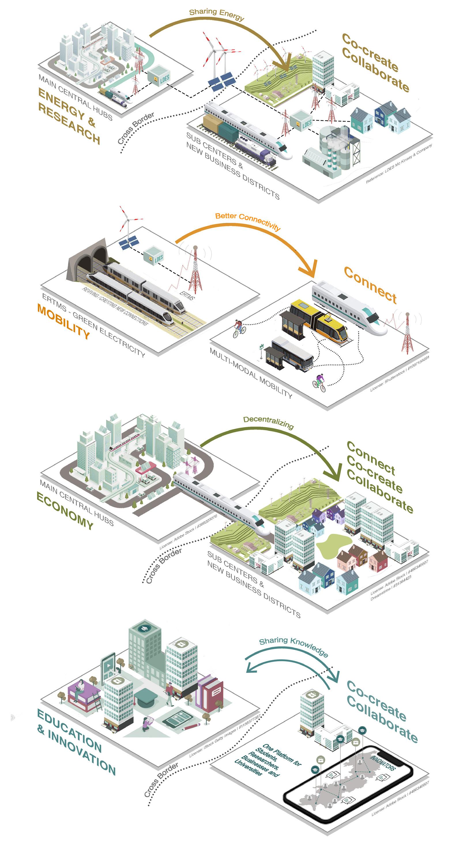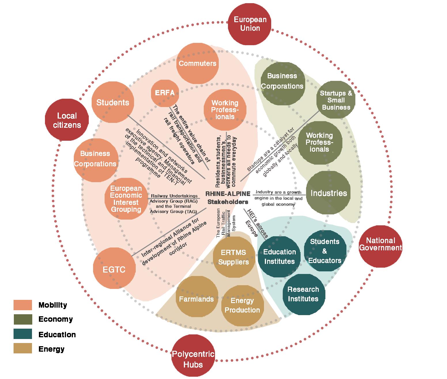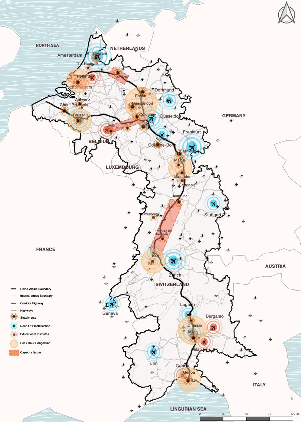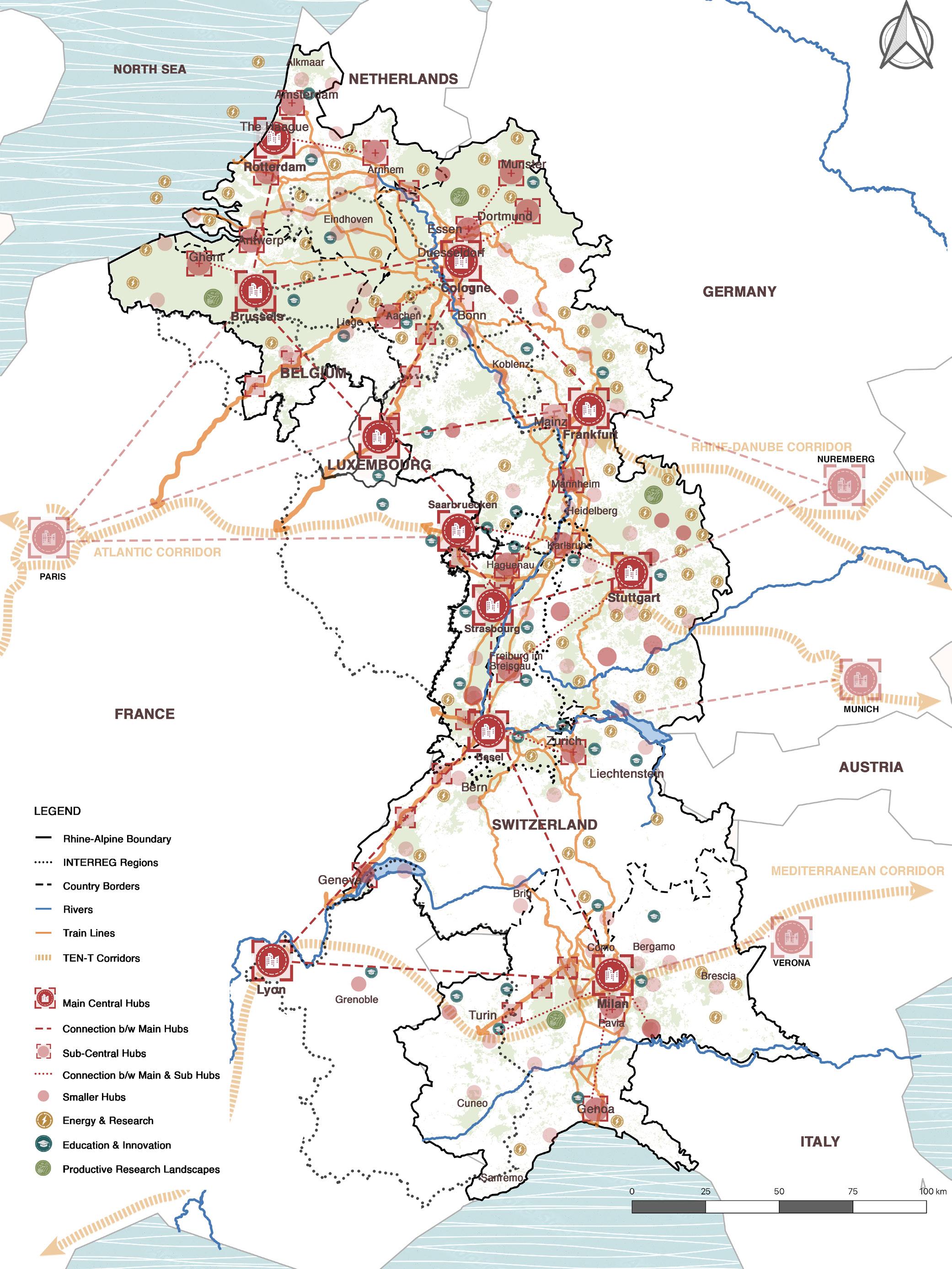 The Corridor Rhine-Alpine is a project to improve rail freight transportation in Europe and to encourage modal shift from road to rail. By filling the missing gaps and introducing the intelligent infrastructure on the train lines and roads we are enhancing the interoperability and reducing the travel time of commuters and connecting smaller towns along the bigger cities. By creating small scale business and innovation districts in these smaller towns we plan to promote small business owners to collaborate with big institutions. By connecting these new small-scale business and innovation districts with Main Central Hubs on either side of the border to create an urban system and collaboration on a national level. By providing areas for energy and productive research landscapes we aim to connect the locals and researchers where they can co-create with the existing. In this way, polycentric development can contribute to reducing regional disparities at all levels. This avoids further excessive economic and demographic concentration within the core areas at EU and national scales and revitalizes less densely settled and economically weaker regions. In the long run, polycentric development contributes to making cities and regions more resilient and diversified, which strengthens the competitiveness of Europe in the global economy.