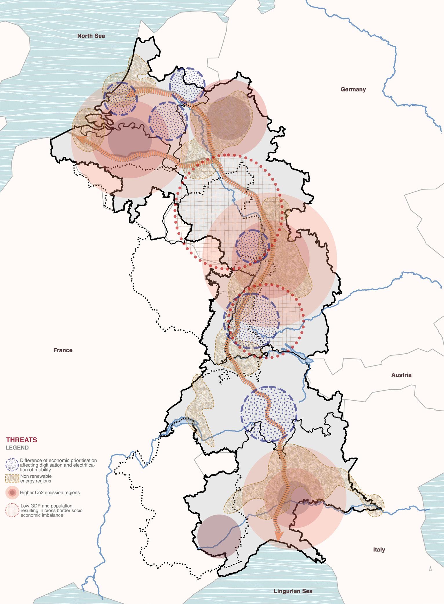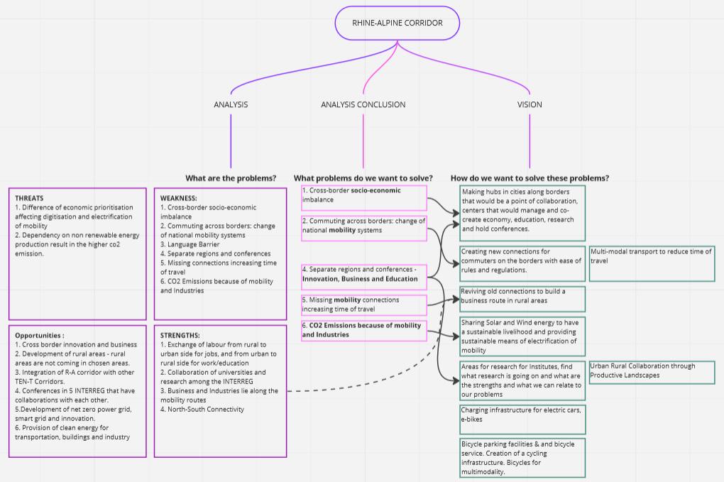 In the next phase, a site analysis was conducted to highlight the main problems on the Rhine Alpine corridor. The key problems were categorized in accordance with four aspects; Mobility, Energy and Research, Economy, and Education. This categorization was used in line with the concept of polycentric urban systems to formulate design strategies. The concept is enriched through the ideology of Collaborating, Co-creating and Connecting the countries across the Rhine Alpine Corridor. The strategies were developed firstly on the Rhine Alpine scale, and then on the PAMINA region scale. The PAMINA region was selected as the focus area for its obvious potential. Moreover, a stakeholder analysis was conducted to identify the potential partners who would invest in the project. Lastly, a time line was proposed divided into three phases, that projects the estimated duration of strategies categorically.