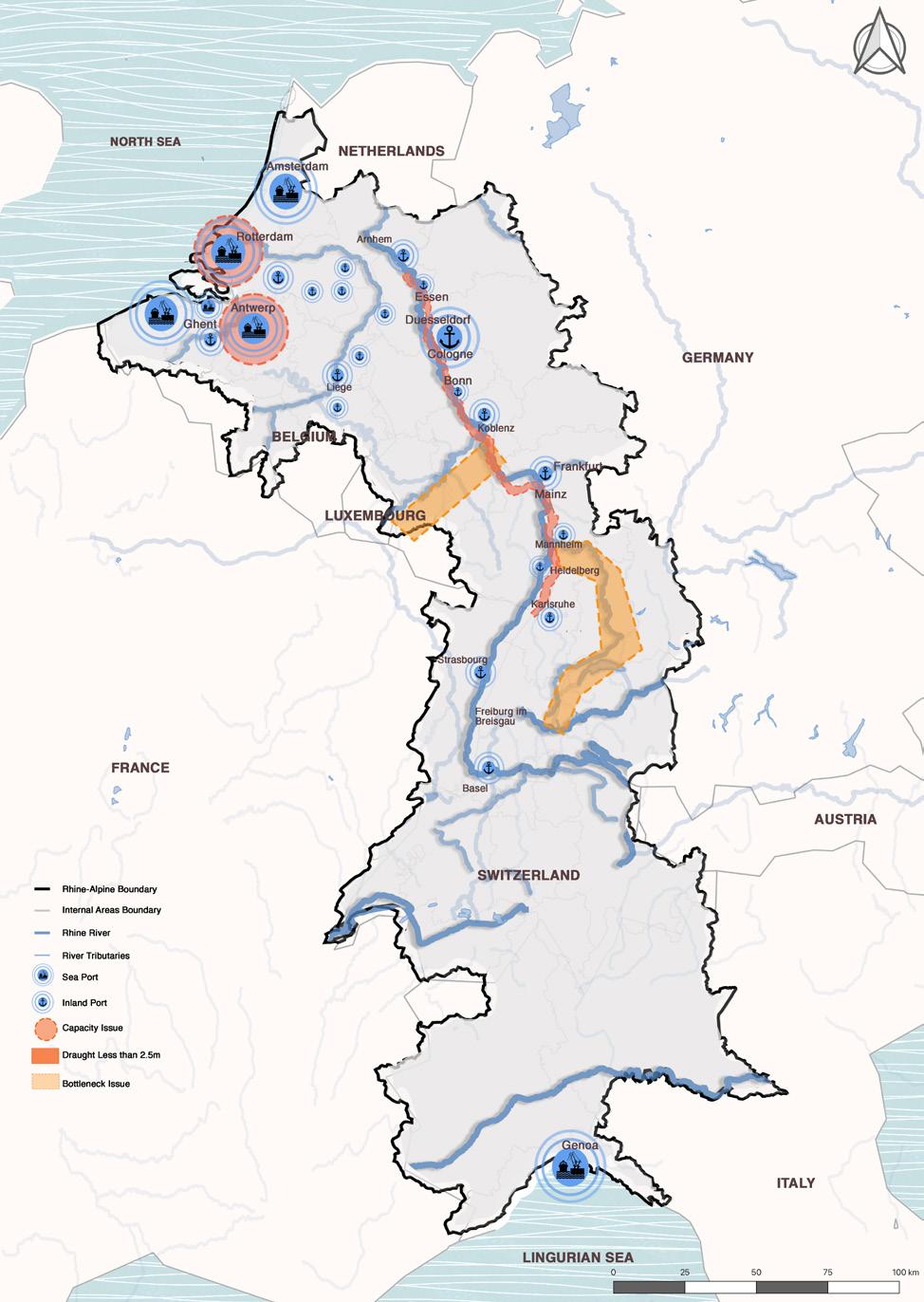 transport over a total length of about 6,200 km. With about 3,000 km rail is the backbone of the Corridor. Road accounts for about 1,500 km. Inland Waterways (IWW) accounts for about 1,700 km2, including the Rhine River as an important route. The Corridor includes 8 seaports and 22 inland ports, 13 airports, 72 core inter-modal terminals and 13 core urban nodes. To allow for a seamless connectivity throughout Europe until 2030, some critical issues have to be addressed such as rail capacity bottlenecks, road congestion, noise and pollution in urban areas, incomplete ERTMS deployment, reliable and efficient navigability on the Rhine River, upgrades of lock capacity, cross border operations and vast maintenance issues of existing infrastructure.
