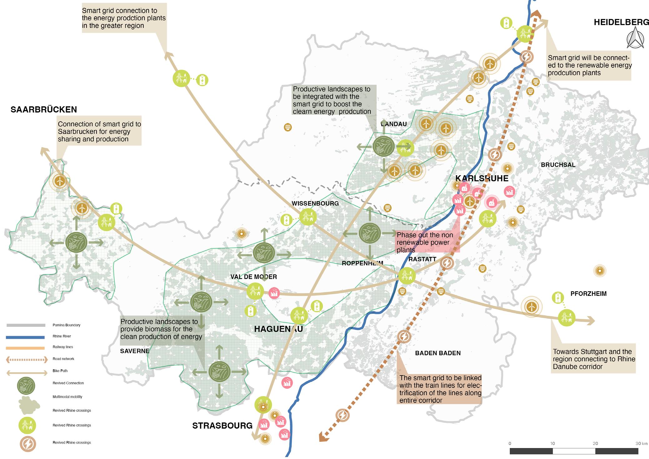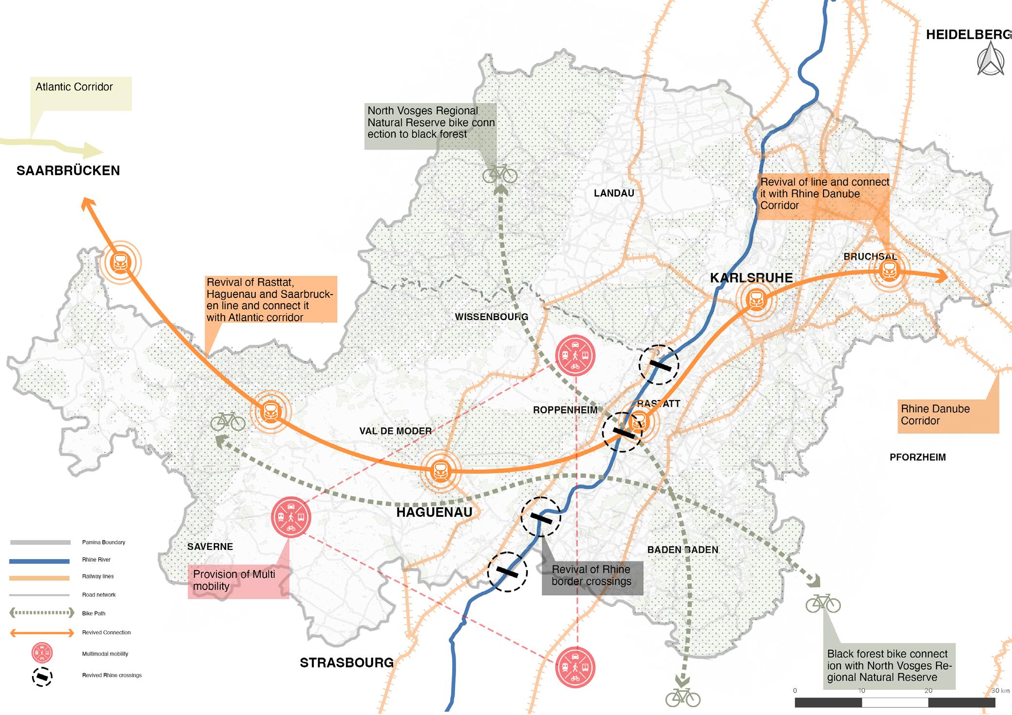 Natural Reserve will be connected to the Black Forrest through bike routes. The missing river crossings are revived through border crossing over the Rhine. The strategy is to enable multi-modality across PAMINA.