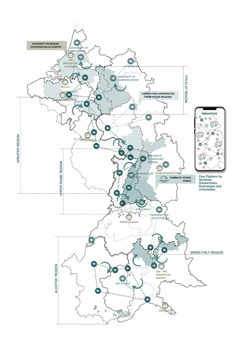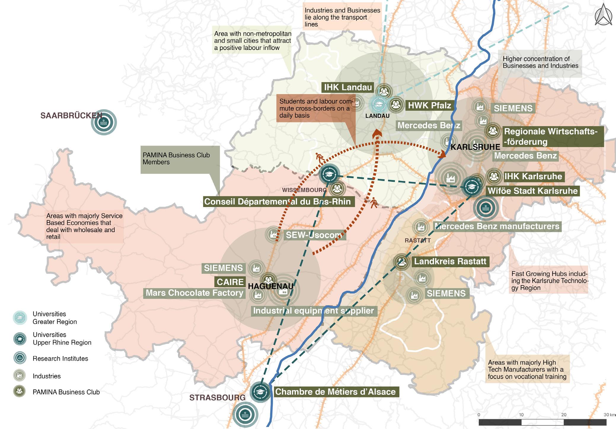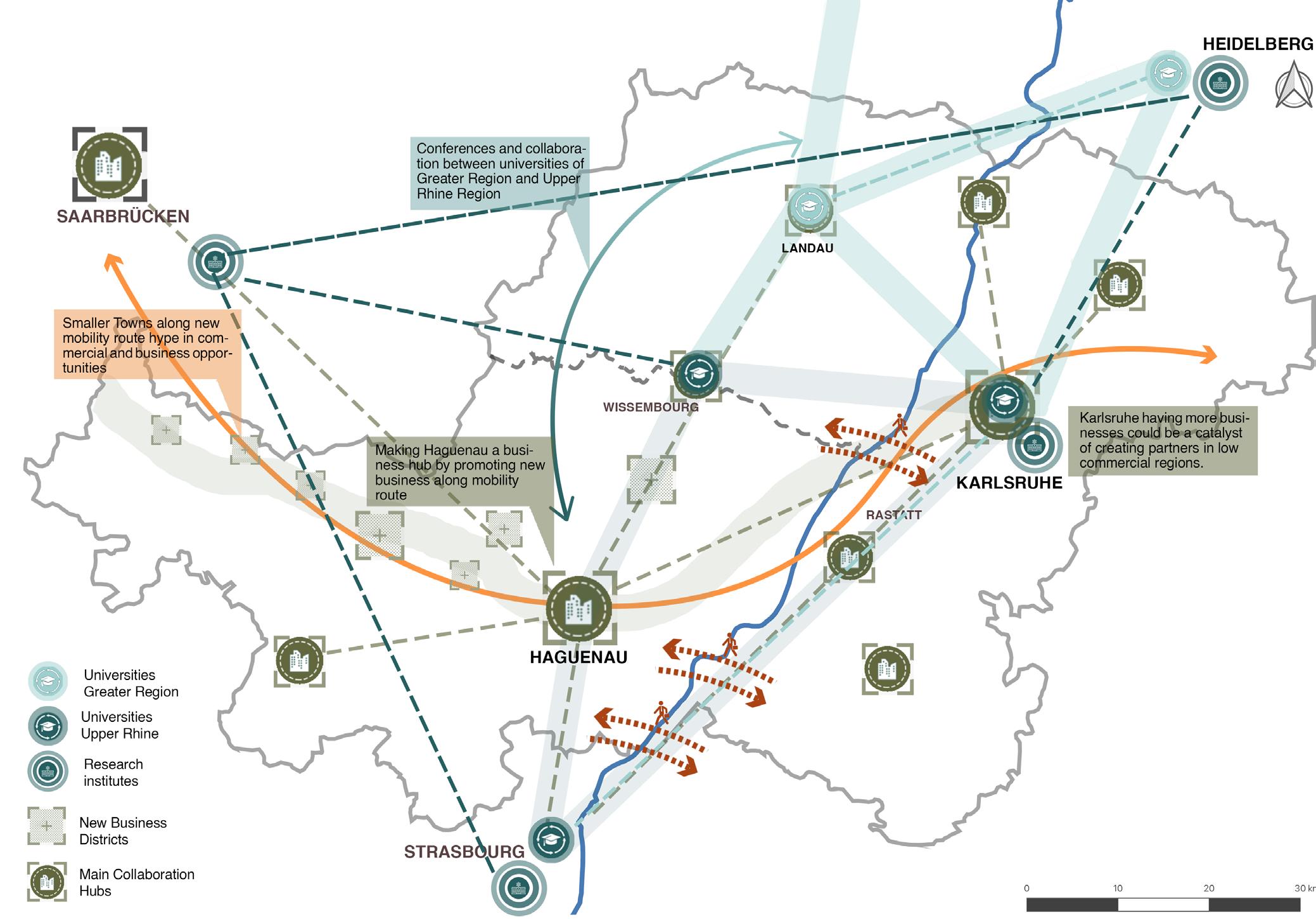 Since Karlsruhe has the most businesses, it could be a catalyst for creating partners in low commercial regions. The educational strategies would enable conferences and collaborations between universities of Greater Region and Upper Rhine Region.