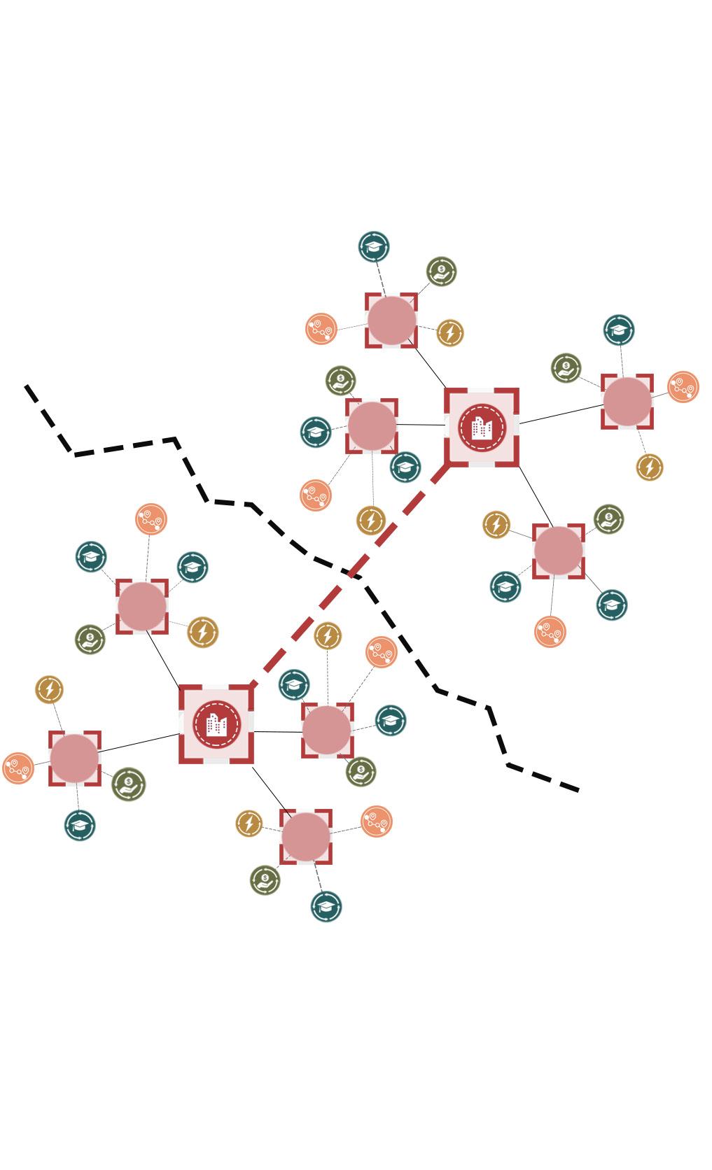 These Major Central Hubs are connected with each other and act as catalysts of our approaches and further connect to the SubCentral Hubs that manage and organize Mobility, Education, Energy and Economy in the various regions as well as supporting