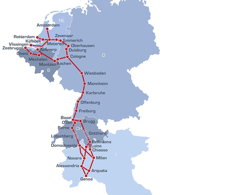 The Corridor Rhine-Alpine is a project to improve rail freight transportation in Europe and to encourage modal shift from road to rail. The Rhine Alpine is located in the “Blue Banana”, the region which is known as the most densely populated and strongest region in Europe. The most significant economic centers are located on the corridor, such as Brussels and Antwerp in Belgium, the Randstad region in the Netherlands, the German Rhine-Ruhr and Rhine-Neckar regions, the Basel and Zürich regions in Switzerland and the Milan and Genova regions in Northern Italy. This multi-modal corridor constitutes one of the busiest freight routes in Europe. It goes over five EU Member States (Belgium, Netherlands, Germany, France, Italy) and Switzerland. There are five more corridors that overlap with the corridor, the North Sea-Baltic, North Sea-Mediterranean, Rhine-Danube, Atlantic, and Mediterranean corridors. The corridor includes all modes of