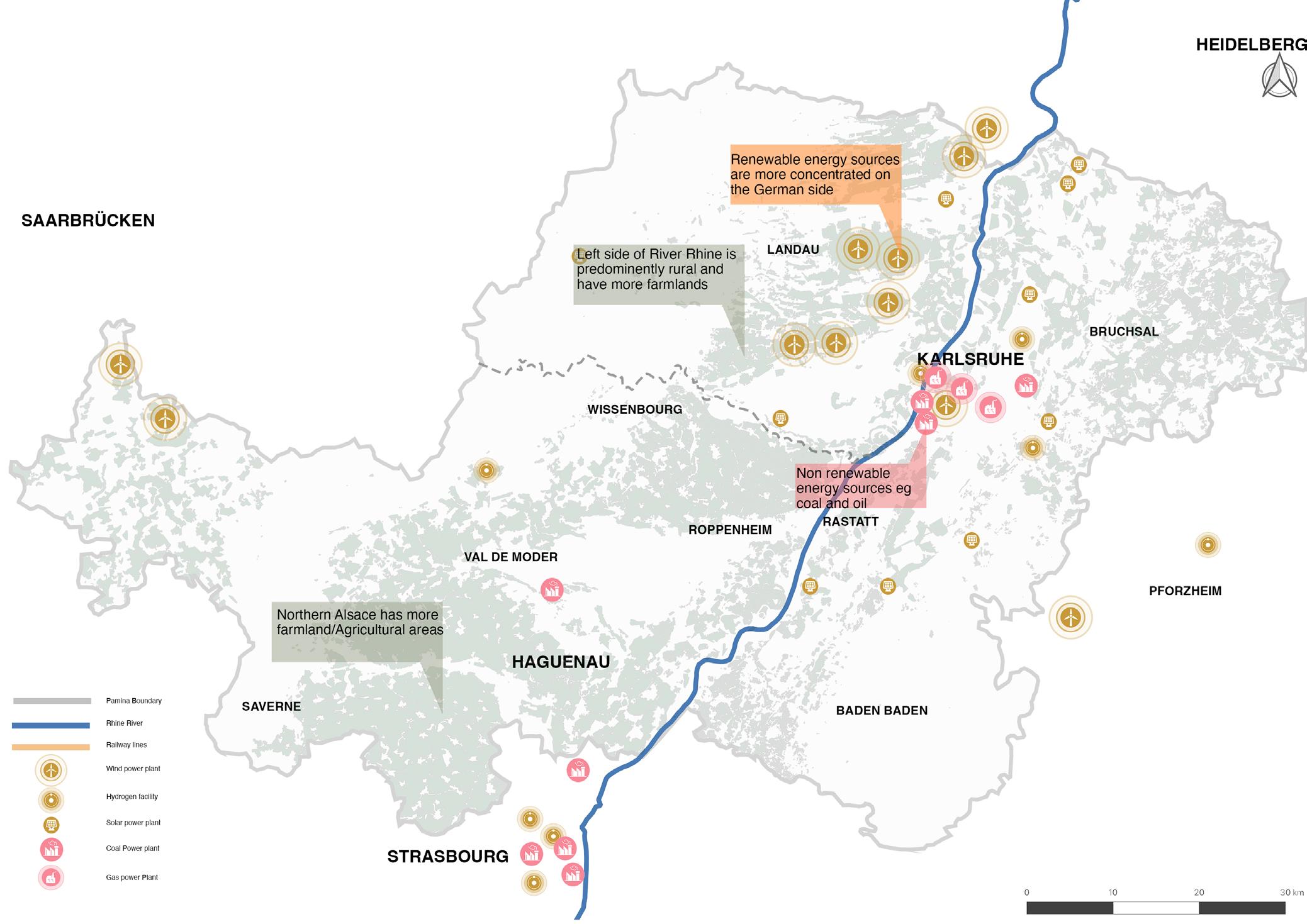 The Northern Alsace has more farmland/ Agricultural areas. The left side of River Rhine is predominantly rural and has more farmlands. The renewable energy sources are more concentrated on the German side.
