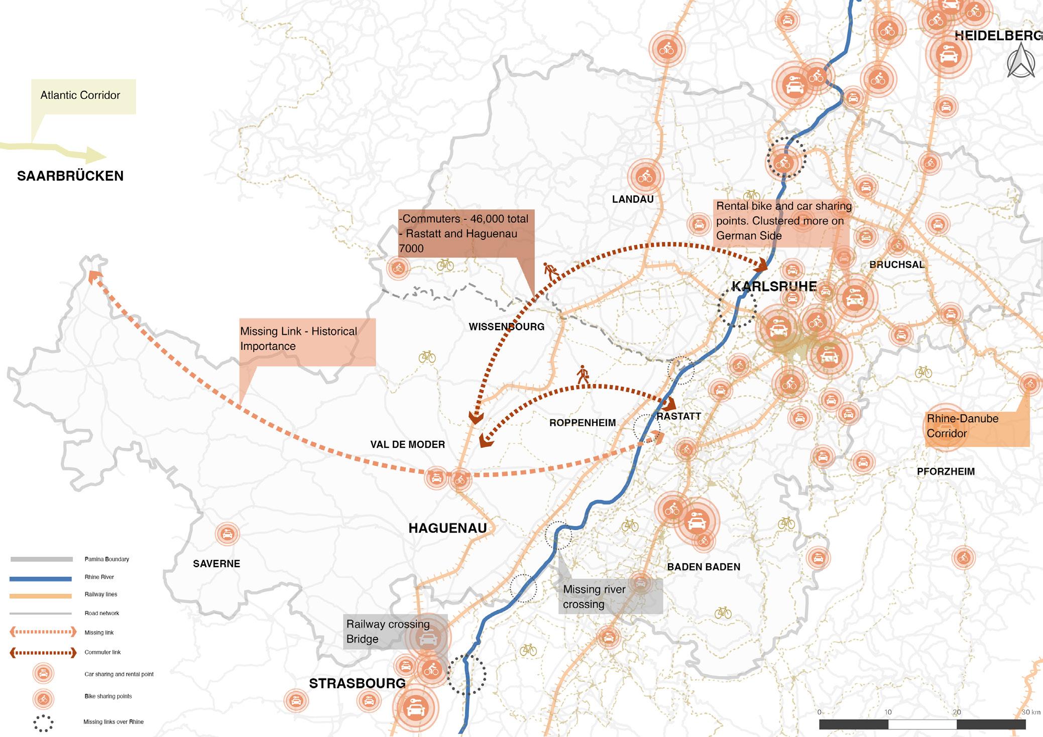 There’s a missing historical link that connects the region to the Atlantic corridor. The rental bike and car sharing points are clustered more on the German side.