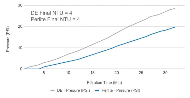 Figure 3: Perlite yields a lower pressure rise than DE with comparable filtrate clarity (NTU).