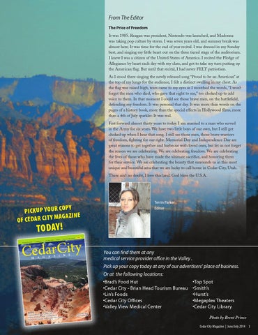 From The Editor The Price of Freedom It was 1985. Reagan was president, Nintendo was launched, and Madonna was taking pop culture by storm. I was seven years old, and summer break was almost here. It was time for the end of year recital. I was dressed in my Sunday best, and singing my little heart out on the three tiered stage of the auditorium. I knew I was a citizen of the United States of America. I recited the Pledge of Allegiance by heart each day with my class, and got to take my turn putting up the American flag. But until that recital, I had never FELT patriotism. As I stood there singing the newly released song “Proud to be an American” at the top of my lungs for the audience, I felt a distinct swelling in my chest. As the flag was raised high, tears came to my eyes as I mouthed the words, “I won’t forget the men who died, who gave that right to me,” too choked up to add voice to them. In that moment I could see those brave men, on the battlefield, defending my freedom. It was personal that day. It was more than words on the pages of a history book, more than the special effects in Hollywood films, more than a 4th of July sparkler. It was real. Fast forward almost thirty years to today. I am married to a man who served in the Army for six years. We have two little boys of our own, but I still get choked up when I hear that song. I still see those men, those brave warriors of freedom, fighting for our right. Memorial Day and Independence Day are great reasons to get together and barbecue with loved ones, but let us not forget the reason we are celebrating. We are celebrating freedom. We are celebrating the lives of those who have made the ultimate sacrifice, and honoring them for their service. We are celebrating the beauty that surrounds us in this most unique and beautiful area that we are lucky to call home in Cedar City, Utah. There ain’t no doubt, I love this land. God bless the U.S.A.