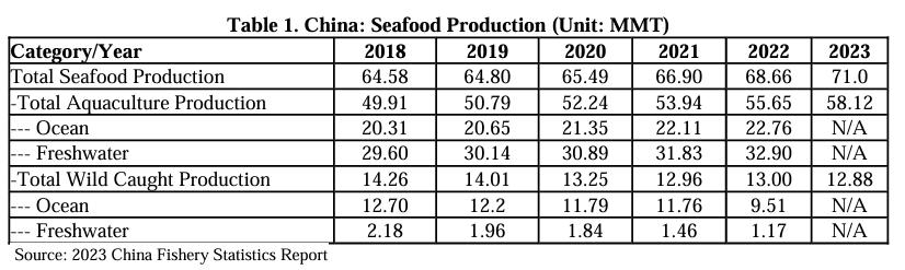• Seafood production increased 3.5% since last year, reaching an estimated 71 million metric tons (mmt), as shown in Table 1. Wild-caught production remained stagnant at 12.9 mmt.