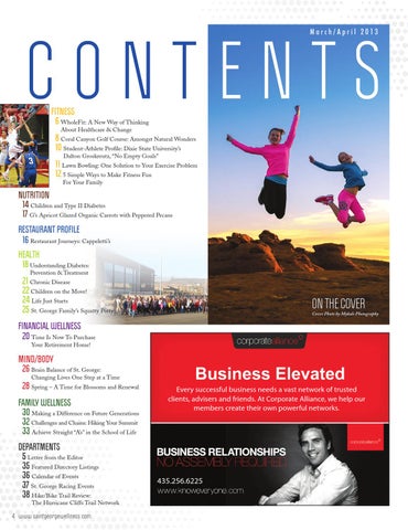 28 S pring – A Time for Blossoms and Renewal FAMILY WELLNESS 30 M aking a Difference on Future Generations 32 C hallenges and Chains: Hiking Your Summit 33 A chieve Straight “A’s” in the School of Life DEPARTMENTS 5 L etter from the Editor 35 F eatured Directory Listings 36 C alendar of Events 37 S t. George Racing Events 38 H ike/Bike Trail Review: