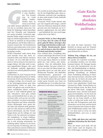 hackets mit Hörnli oder Hackbraten. Wie kommt eine 16 Gault Millau PunkteKöchin dazu, so etwas zu servieren und dabei äusserst glücklich zu sein? Um das zu verstehen, muss man vielleicht ihr bisheriges Leben betrachten und ihre Wünsche und Sehnsüchte ein wenig verstehen. Esoterisch angehauchte Seelen mögen auch die Astrologie zur Erklärung bemühen, Françoise Wicki ist nämlich im Sternzeichen Krebs geboren, und Krebse sollen ja einerseits einmal sehr viel Familiensinn besitzen und andererseits in der ersten Lebenshälfte von einer gewissen Unruhe geplagt werden. Wickis Lebenslauf raubt einem denn auch beinahe etwas den Atem. Erstaunlich offen und ehrlich resumiert sie heute: «Es war wohl alles ein bisschen zu viel in zu kurzer Zeit und in zu jungen Jahren. Ich habe mich in meinem jugendlichen Ehrgeiz, aber auch als Suchende wahrlich abgerackert, und dann war ich halt plötzlich einfach ausgebrannt.» Unbestritten ist, dass Françoise Wicki über die nötigen Ressourcen an Talent, Kreativität, Kraft und Durchsetzungsvermögen verfügt, die es braucht, um in der Spitzengastronomie ganz oben mitzumischen. Sicher ist auch, dass Wicki viel gelernt und erreicht hat in diesen turbulenten Jahren zwischen 20 und 37. Und vielleicht gehörte das sich «Abrackern» eben ganz einfach dazu, um letztendlich dort zu sein, wo sie heute steht, und um das verwirklichen zu können, was ihren ursprünglichen Wünschen und Ideen entspricht. Wickis Philosophie einer guten Küche habe sich nämlich nicht geändert, und wie viele musste sie wohl erst ihre Sporen abverdienen, um ihre Vorstellungen heute auf die richtige Art und Weise in die Tat umsetzen zu können: Als Gastgeberin in einem Etablissement so zu wirken, dass Haus und Küche in sich stimmig miteinander im Einklang stehen. Speisen zu servieren, die ein Gespräch, ein Meeting, oder ein Date unterstützen und ein Erlebnis des Wohlbefindens hinterlassen. An einem