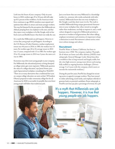 Recruitment PureFlo Water in Santee, California, has been in business since 1958. The company employs 78 people, 26 of whom are home and office delivery (HOD) route salespeople. General Manager Leslie Alstad describes a workforce that is long-tenured and largely stable, but she cites high turnover among route drivers and staying fully staffed as ongoing business challenges. (Drivers average 3 to 5 years with the company, which meets or exceeds the nationwide medians.) During the past few years, PureFlo has changed its recruiting tactics to appeal to younger workers. They have turned to online advertising, social media, and employee referrals to generate leads on potential candidates. Route salespeople at PureFlo earn base pay plus a percentage of revenue. It’s a job