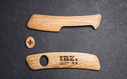 Les côtes, en bois de chêne, de noyer ou d’olivier, sous-traitées pour Helvetica Brands SA (SWIZA®), sont prêtes à être appliquées sur le couteau.