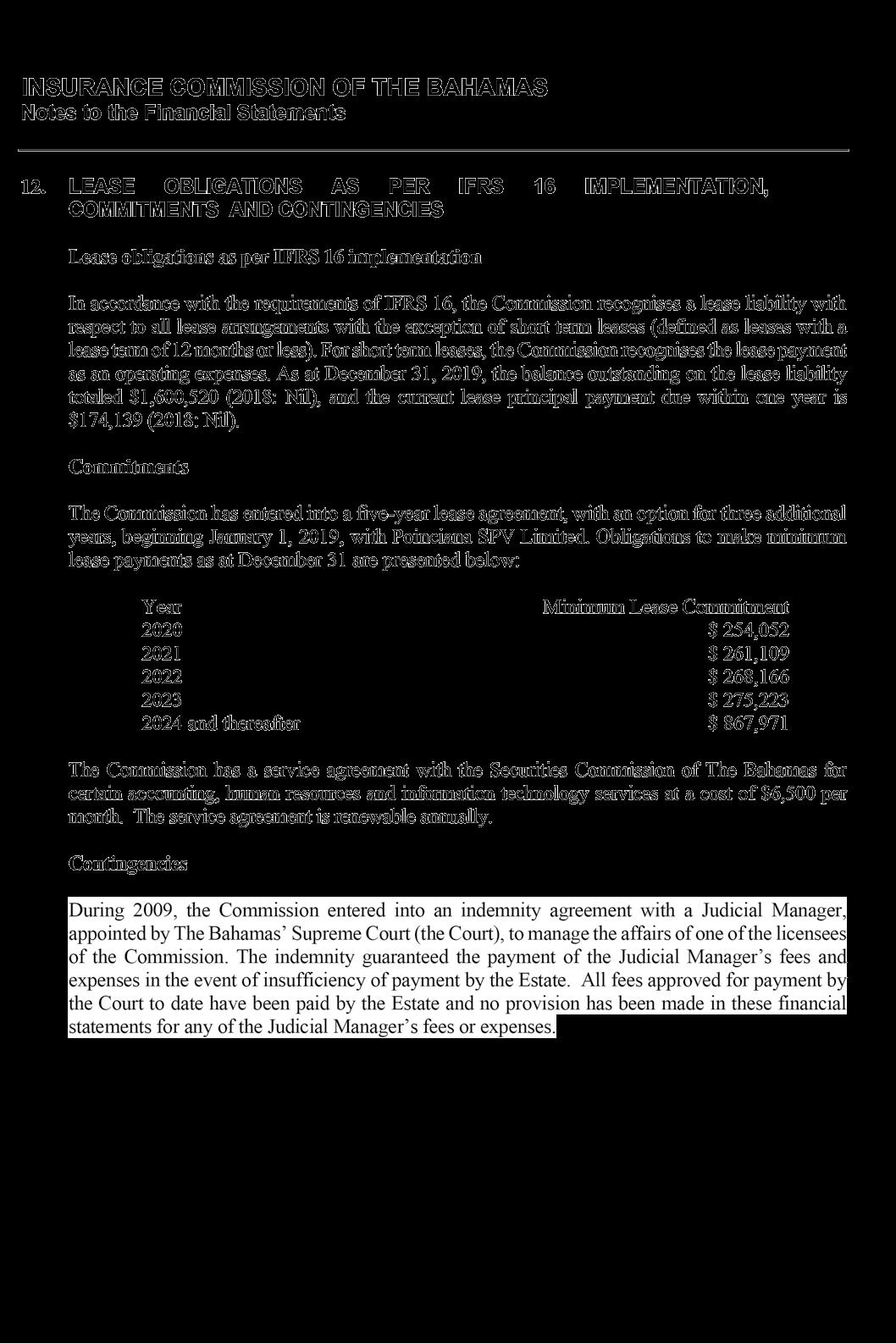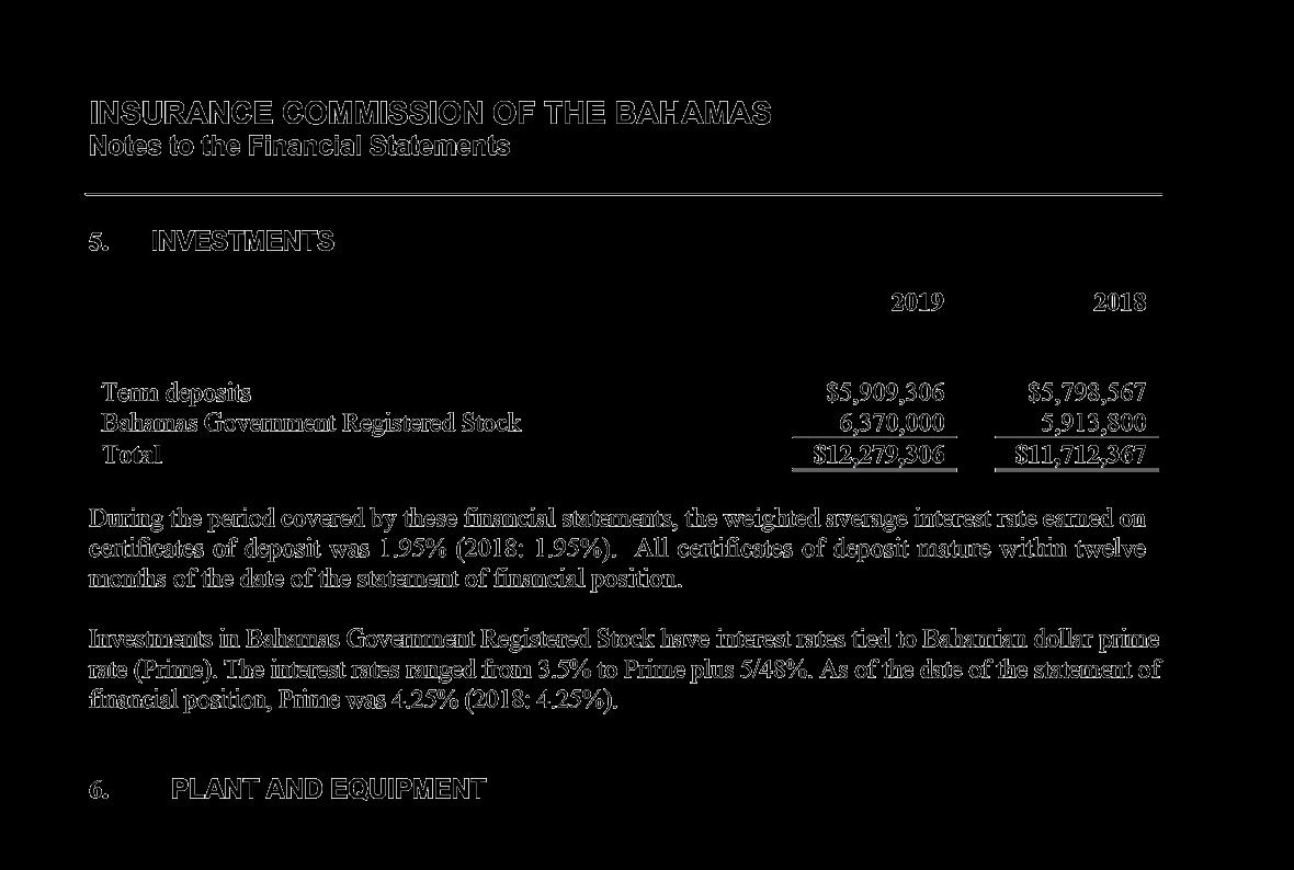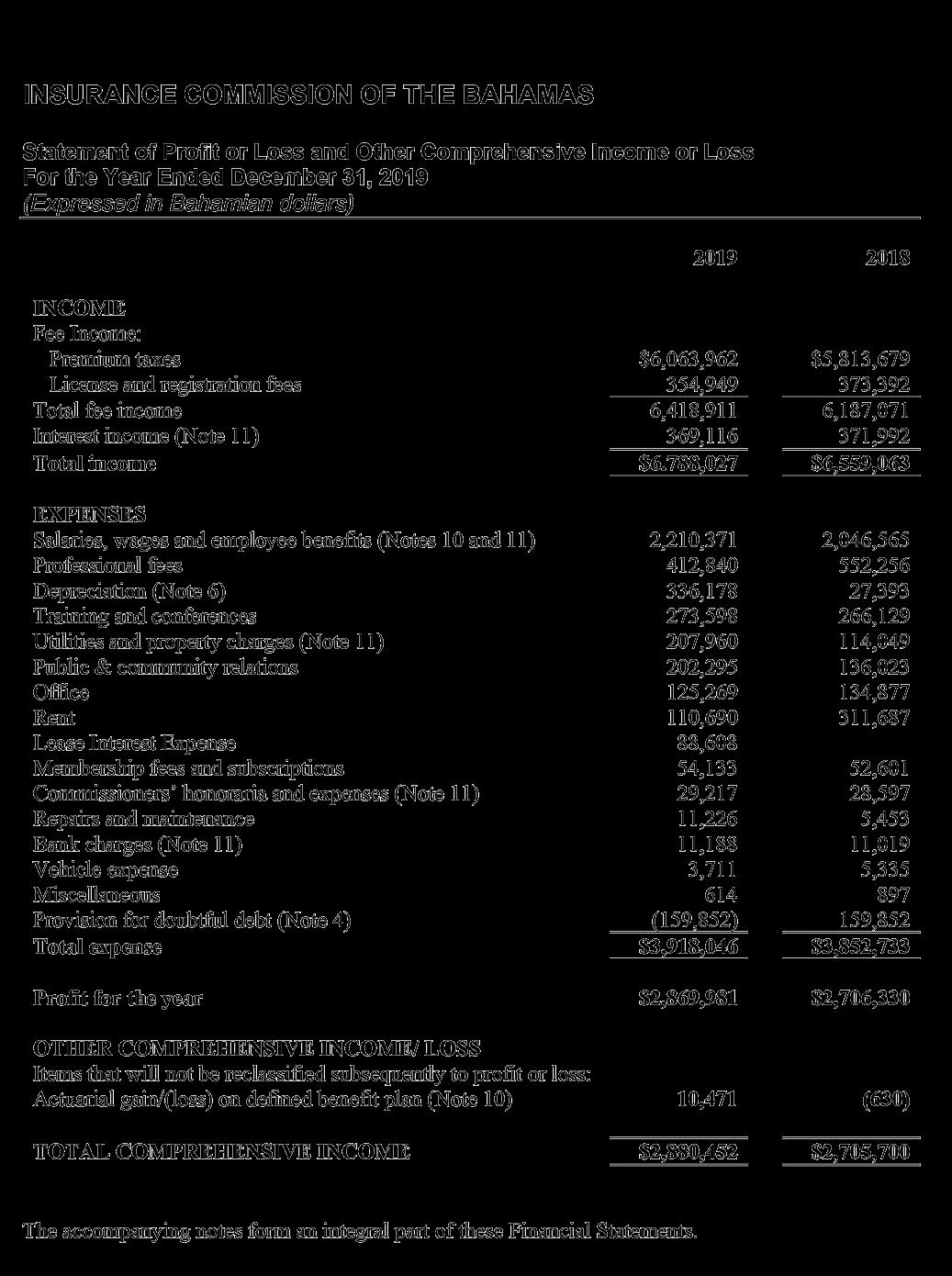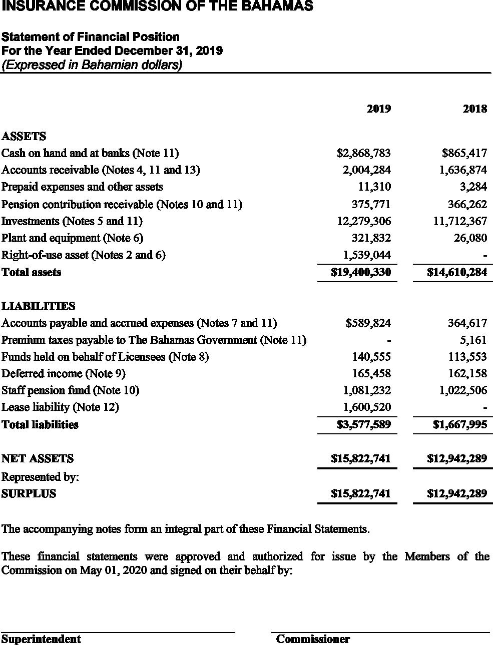 derived substantially from the retention of 25% of the premium tax collected from licensees on behalf of the Government, amounted to $6.79 million, and remained stable compared to the prior year, in line with the modest change in gross premiums written by the insurance industry. Total expenses of $2.87 million were contained in line with budget, after taking into effect the new accounting standard International Financial Reporting Standard (IFRS) 16 related to leased property and the reversal of a provision for VAT recoverable established in the prior year. IFRS 16 also required the establishment of a “right-of-use asset” in the amount of $1.76 million and a corresponding liability on the Statement of Financial Position based on the terms of the lease entered into as at January 2019 for the Commission’s new premises at Poinciana House, East Bay Street.