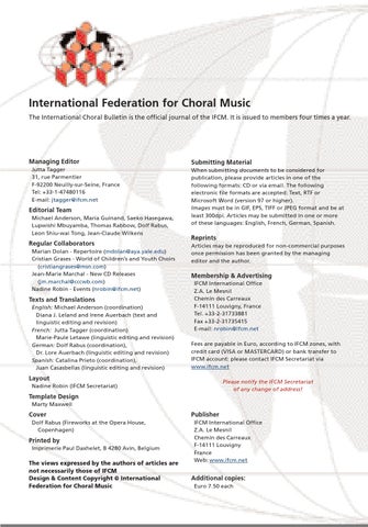 Printed by Imprimerie Paul Daxhelet, B 4280 Avin, Belgium The views expressed by the authors of articles are not necessarily those of IFCM Design & Content Copyright © International Federation for Choral Music