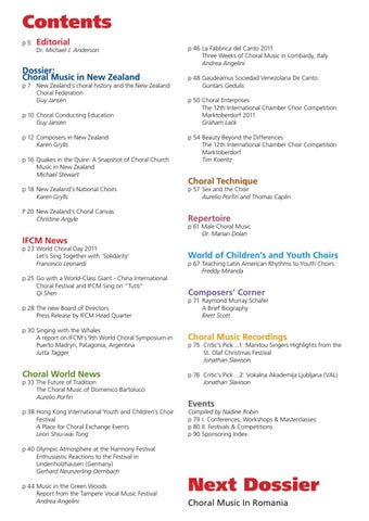 p 7 New Zealand’s choral history and the New Zealand Choral Federation Guy Jansen p 10 Choral Conducting Education Guy Jansen p 12 Composers in New Zealand Karen Grylls p 16 Quakes in the Quire: A Snapshot of Choral Church Music in New Zealand Michael Stewart p 18 New Zealand’s National Choirs Karen Grylls P 20 New Zealand’s Choral Canvas Christine Argyle