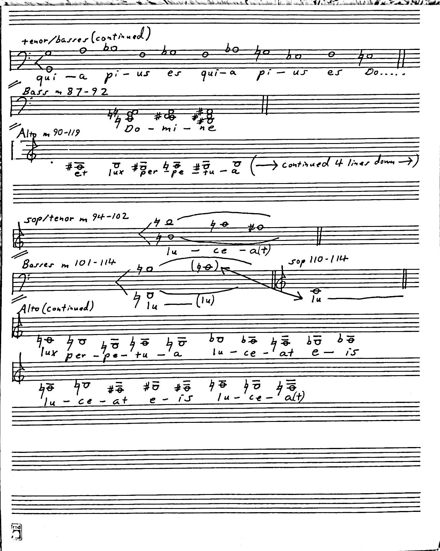 Zusätzlich haben die Bässe zwei kurze homophone Momente, beide auf dem Wort „Domine“. Der erste ist im höchsten Falsett-Bereich (T 37-41), während der zweite (T 87-92) sich in einen dis-Moll Dreiklang „auflöst“ (übrigens der einzige derartige Akkord im ganzen Stück).