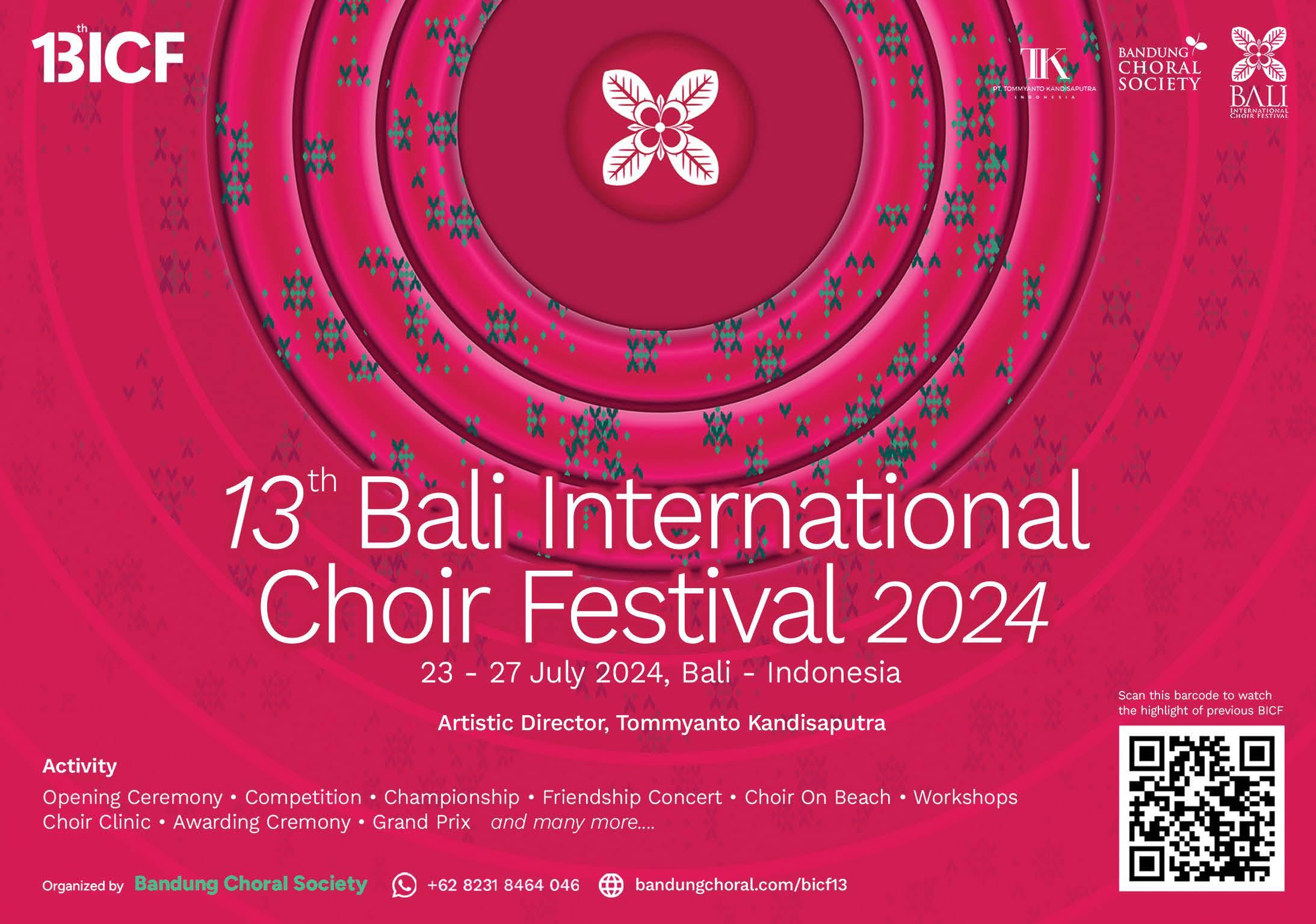 13th Bali International Choir Festival 2024, Kuta, Bali, Indonesia, 23-27 July 2024. Contact: Bandung Choral Society, Tommyanto Kandisaputra, Email: mailbcsevents@gmail.com - Website: https://www. bandungchoral.com/
